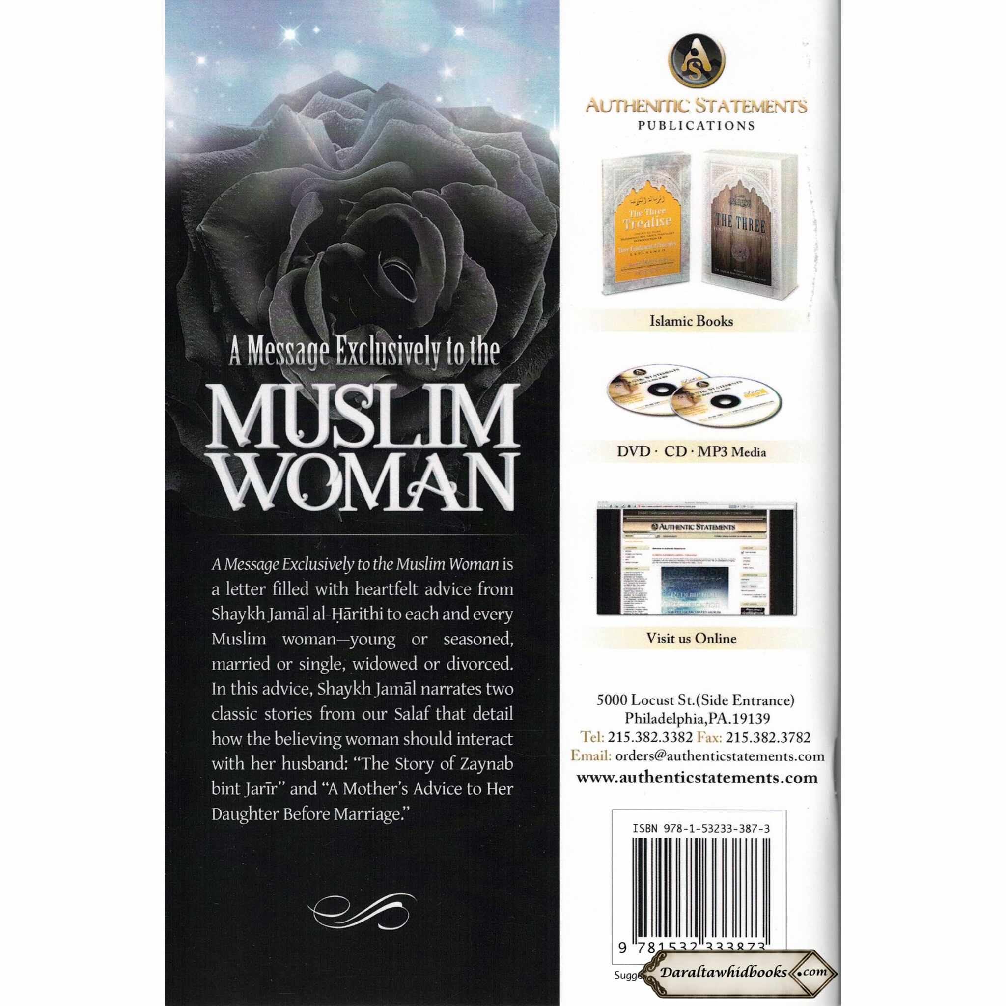 Shaykh Jamal Al-Harithi's "A Message Exclusively to the Muslim Woman" is a particular and dedicated message to Muslim women. Shaykh Jamal Al-Harithi addresses Muslim women in this book with crucial counsel and advice adapted to their specific roles and obligations in Islam.The book delves into numerous facets of a Muslim woman's life, such as her relationship with Allah, family, and community.