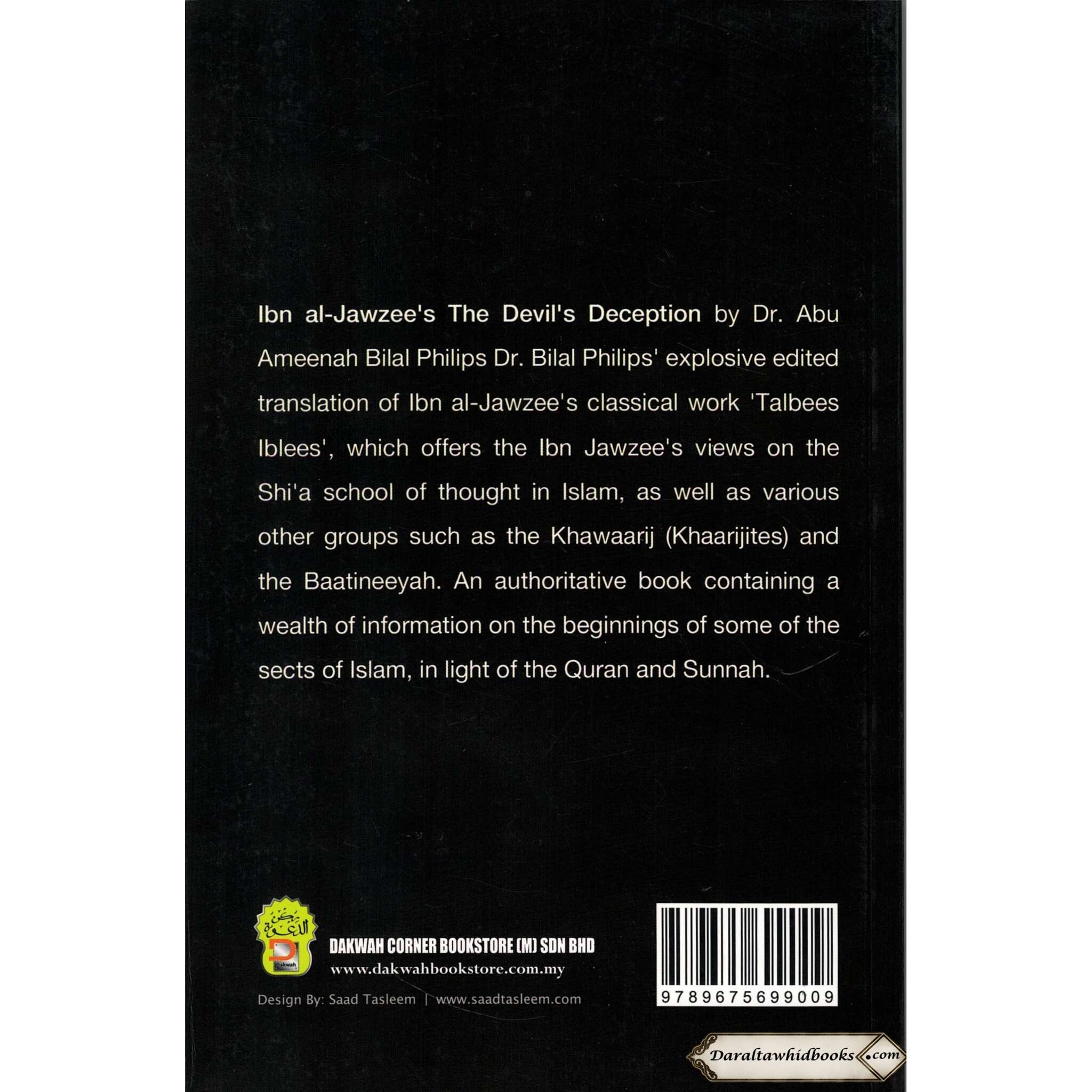 Ibn al-Jawzee's The Devil's Deception by Dr. Abu Ameenah Bilal Philips Dr. Bilal Philips' explosive edited translation of Ibn al-Jawzee's classical work 'Talbees Iblees', which offers the Ibn al-Jawzee's views on the Shi'a school of thought in Islam, as well as various other groups such as the Khawaarij (Khaarijites) and the Baatineeyah. An authoritative book containing a wealth of information on the beginnings of some of the sects of Islam, in light of the Quran and Sunnah Imam Ibn Al-Jawzi goes into the methods and techniques used by Satan to confuse and mislead people in this stimulating book. The book "The Devil's Deception" examines the different strategies Satan employs to lead people away from the straight road of righteousness and towards disobedience and immorality. Imam Ibn Al-Jawzi provides insights into the intricate traps laid by the devil and offers advice on how to recognize and fight them by drawing from Quranic passages, prophetic traditions, and his broad understanding of Islamic doctrines.