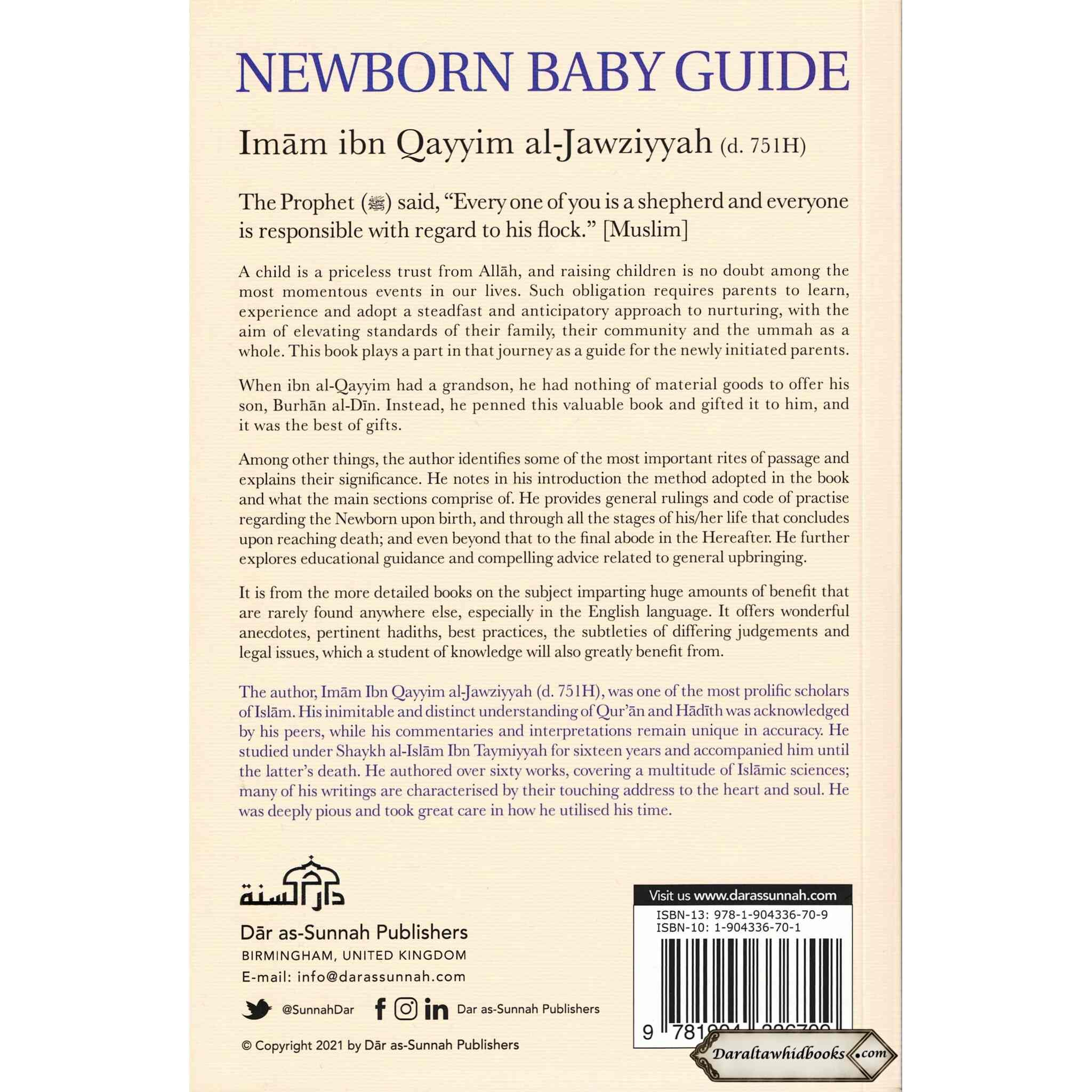 The Prophet said, "Every one of you is a shepherd and everyone is responsible with regard to his flock." [Muslim] A child is a priceless trust from Allah, and raising children is no doubt among the most momentous events in our lives. Such obligation requires parents to learn, experience and adopt a steadfast and anticipatory approach to nurturing, with the aim of elevating standards of their family, their community and the ummah as a whole. This book plays a part in that journey as a guide for the newly initiated parents.When ibn al-Qayyim had a grandson, he had nothing of material goods to offer his son, Burhan al-Din. Instead, he penned this valuable book and gifted it to him, and it was the best of gifts.Among other things, the author identifies some of the most important rites of passage and explains their significance. He notes in his introduction the method adopted in the book and what the main sections comprise of. He provides general rulings and code of practice regarding the Newborn upon birth, and through all the stages of his/her life that concludes upon reaching death; and even beyond that to the final abode in the Hereafter. He further explores educational guidance and compelling advice related to general upbringing.It is from the more detailed books on the subject imparting huge amounts of benefit that are rarely found anywhere else, especially in the English language. It offers wonderful anecdotes, pertinent hadiths, best practices, the subtleties of differing judgements and legal issues, which a student of knowledge will also greatly benefit from.