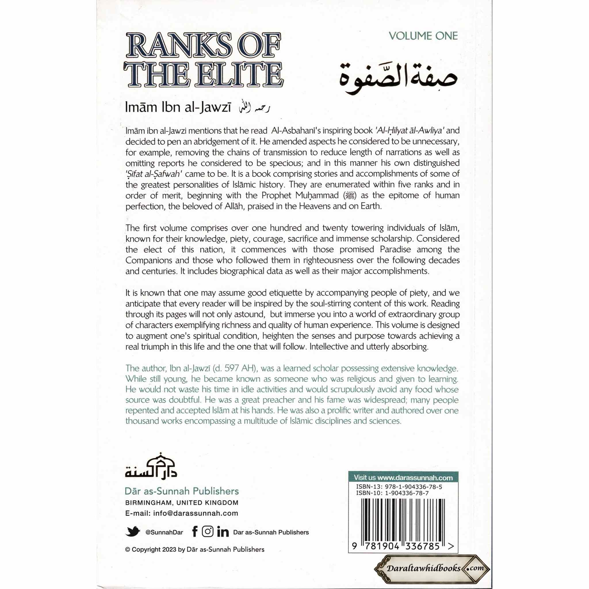 Ranks of The Elite - Volume One by Imam Ibn al-Jawzi, after being intoxicated by the Ranks of The Elite - Volume One "Al-Hilyat al-Awliya" authored by al-Asbahani, decided to embark on the project of extracting and completing a similar book with the title "Sifat al-Safwah". This was his way of making it short and straightened out so that a brief and essential part of the history of the person they admired would be highlighted, and the excess details removed to be replaced by the details that were considered the most important.