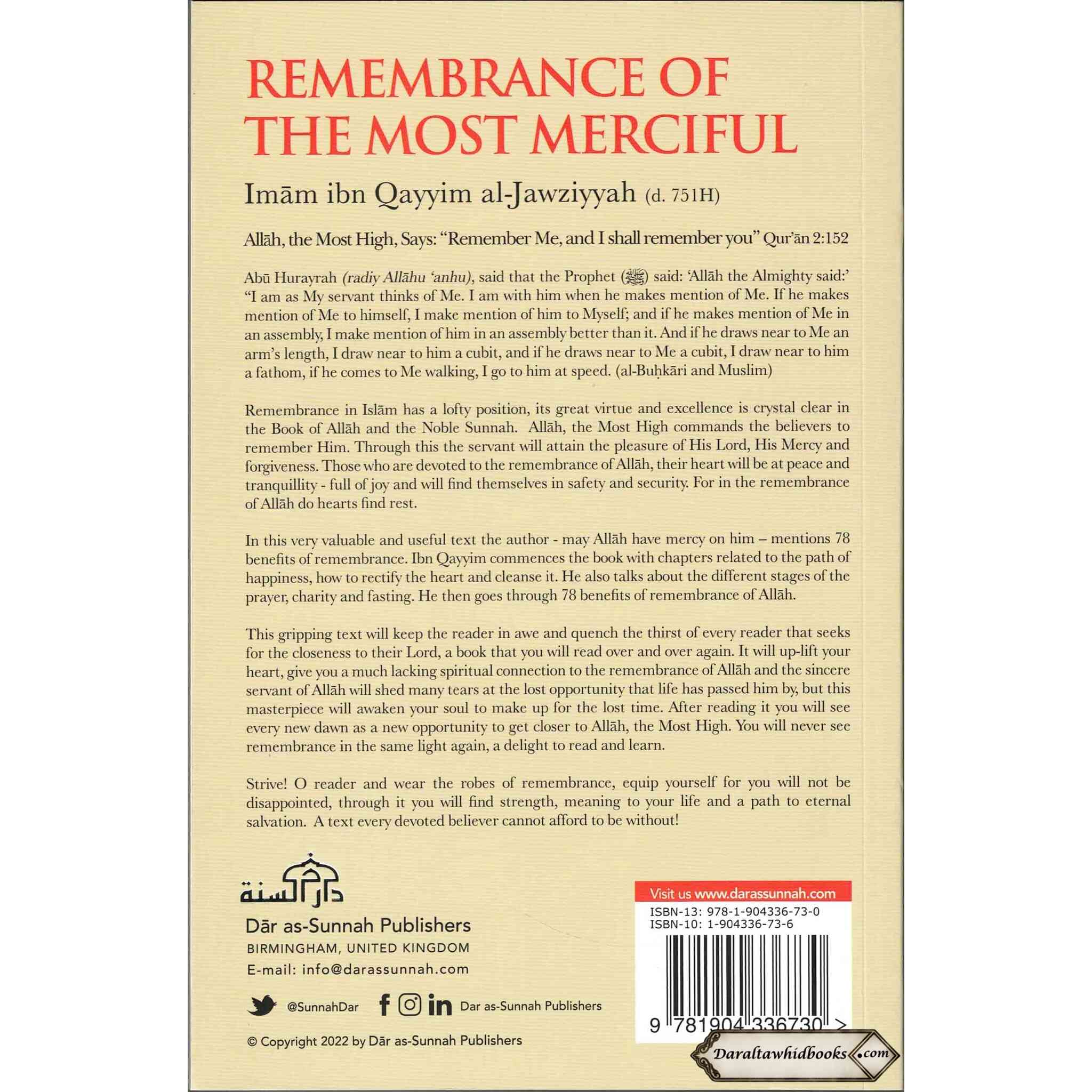 Remembrance of the Most Merciful this gripping text will keep the reader in awe and quench the thirst of every reader that seeks for the closeness to their Lord, a book that you will read over and over again. Remembrance of the Most Merciful will up-lift your heart, give you a much lacking spiritual connection to the remembrance of Allah and the sincere servant of Allah will shed many tears at the lost opportunity that life has passed him by, but this masterpiece will awaken your soul to make up for the lost time. After reading it you will see every new dawn as a new opportunity to get closer to Allah, the Most High.You will never see remembrance in the same light again, a delight to read and learn. Strive! O reader and wear the robes of remembrance, equip yourself for you will not be disappointed, through it you will fi nd strength, meaning to your life and a path to eternal salvation. A text every devoted believer cannot afford to be without!