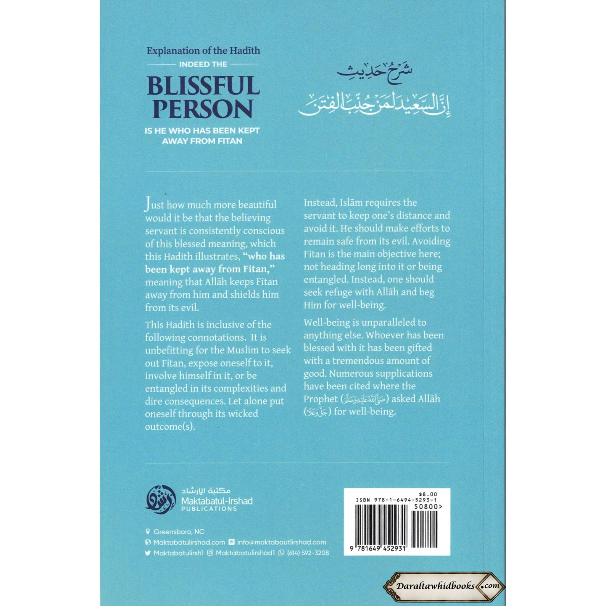 The hadith narrated by Abu Hurairah (may Allah be pleased with him) from the Prophet Muhammad (peace be upon him) is thoroughly and in-depth analyzed in the book "Explanation of the Hadith: Indeed the Blissful Person Is He Who Has Been Kept Away from Fitan" by Shaykh Abdur Razzaq ibn Abdul-Muhsin Al-Abbad Al-Badr. Indeed, the one who has avoided fitan is the happiest. This book explores a variety of fitan-related topics, including their numerous varieties, underlying reasons, and ways to avoid falling prey to them. A selection of supplications to find safety from Fitan are also included.