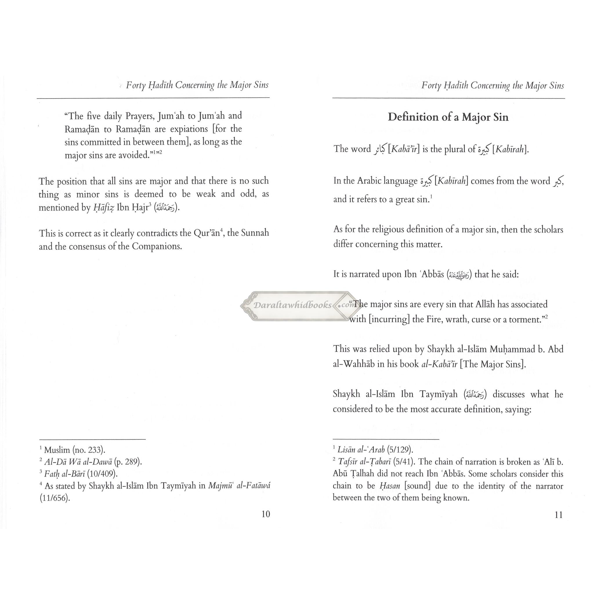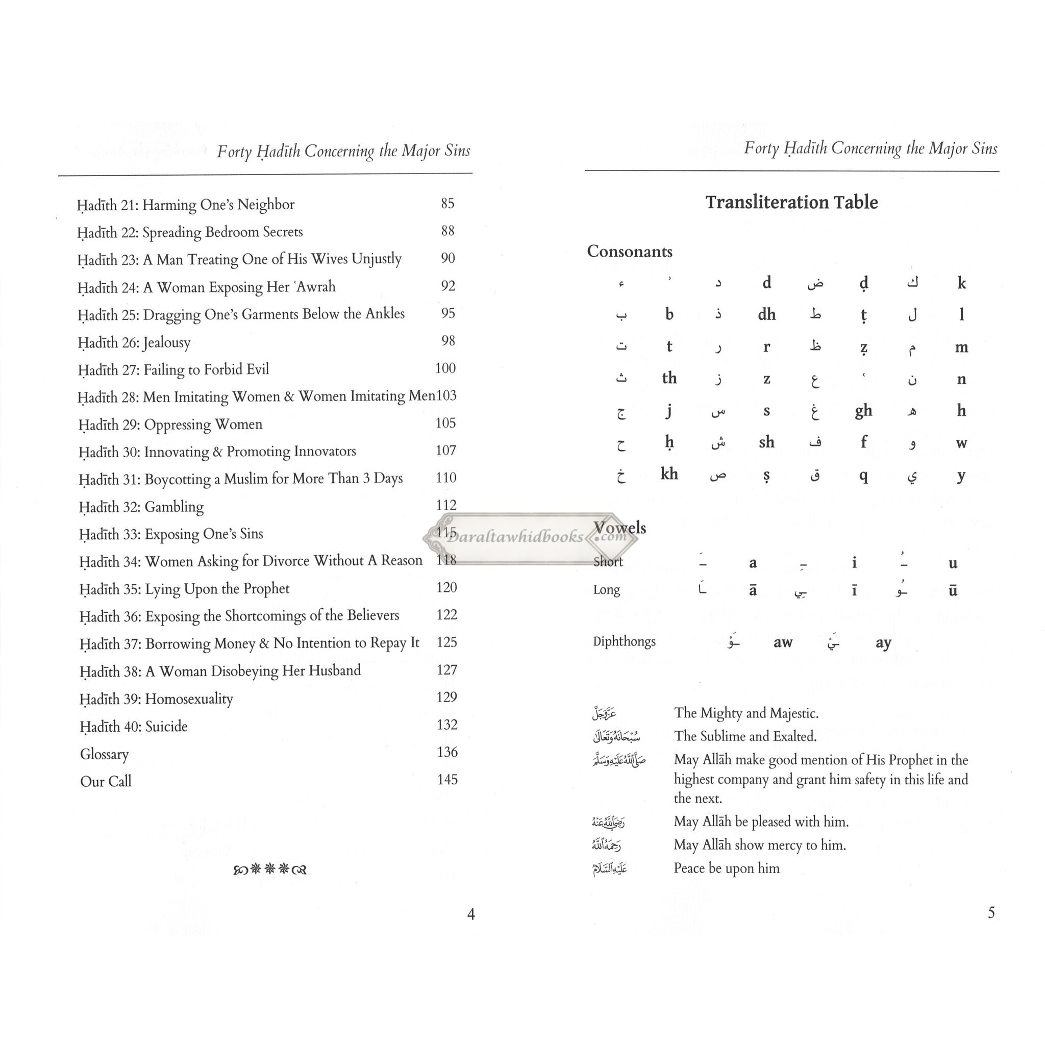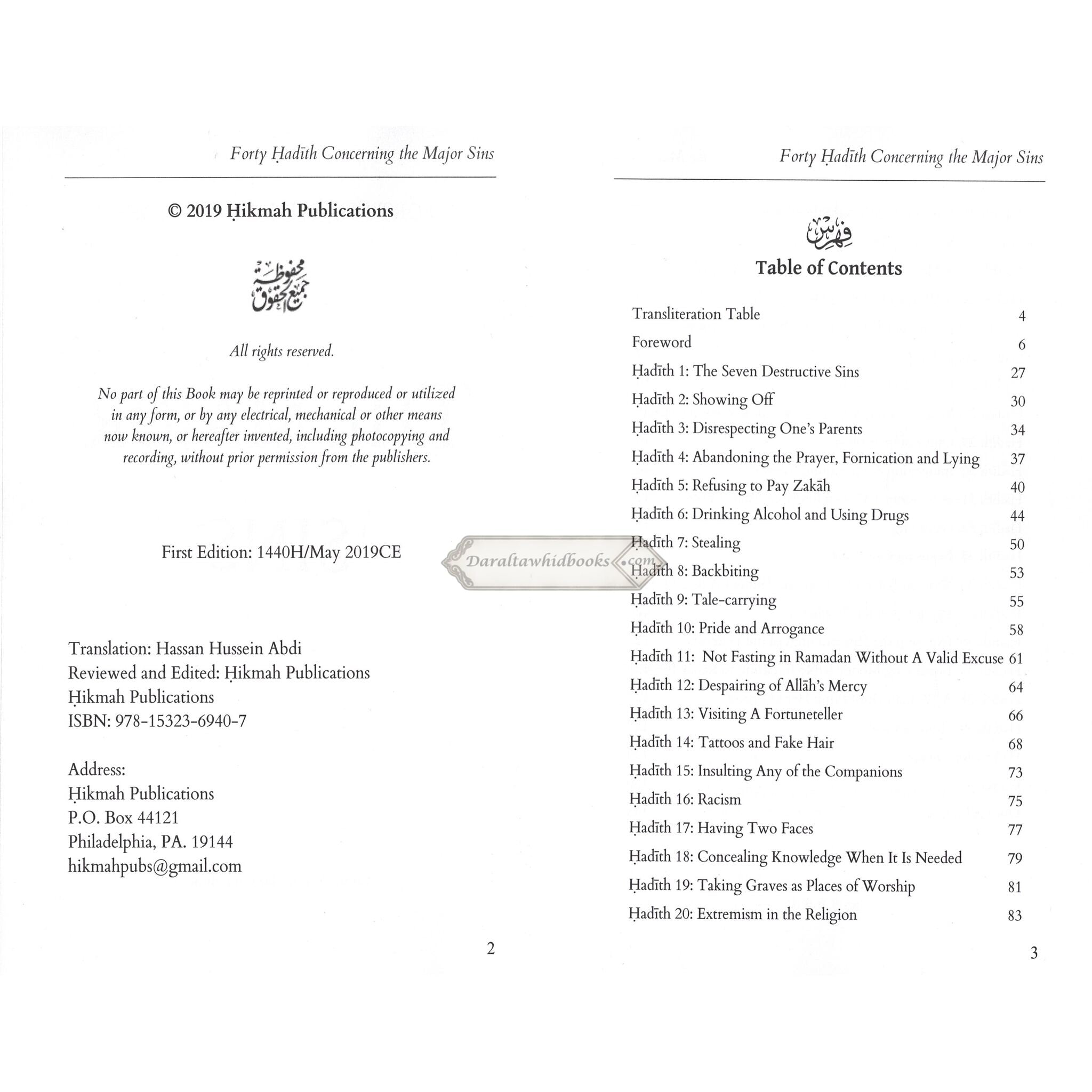 Hassan Somali's book "Forty Hadith Concerning The Major Sins" It collects forty of the Prophet Muhammad's sayings on the major no-nos in Islam. The book is divided into three sections: