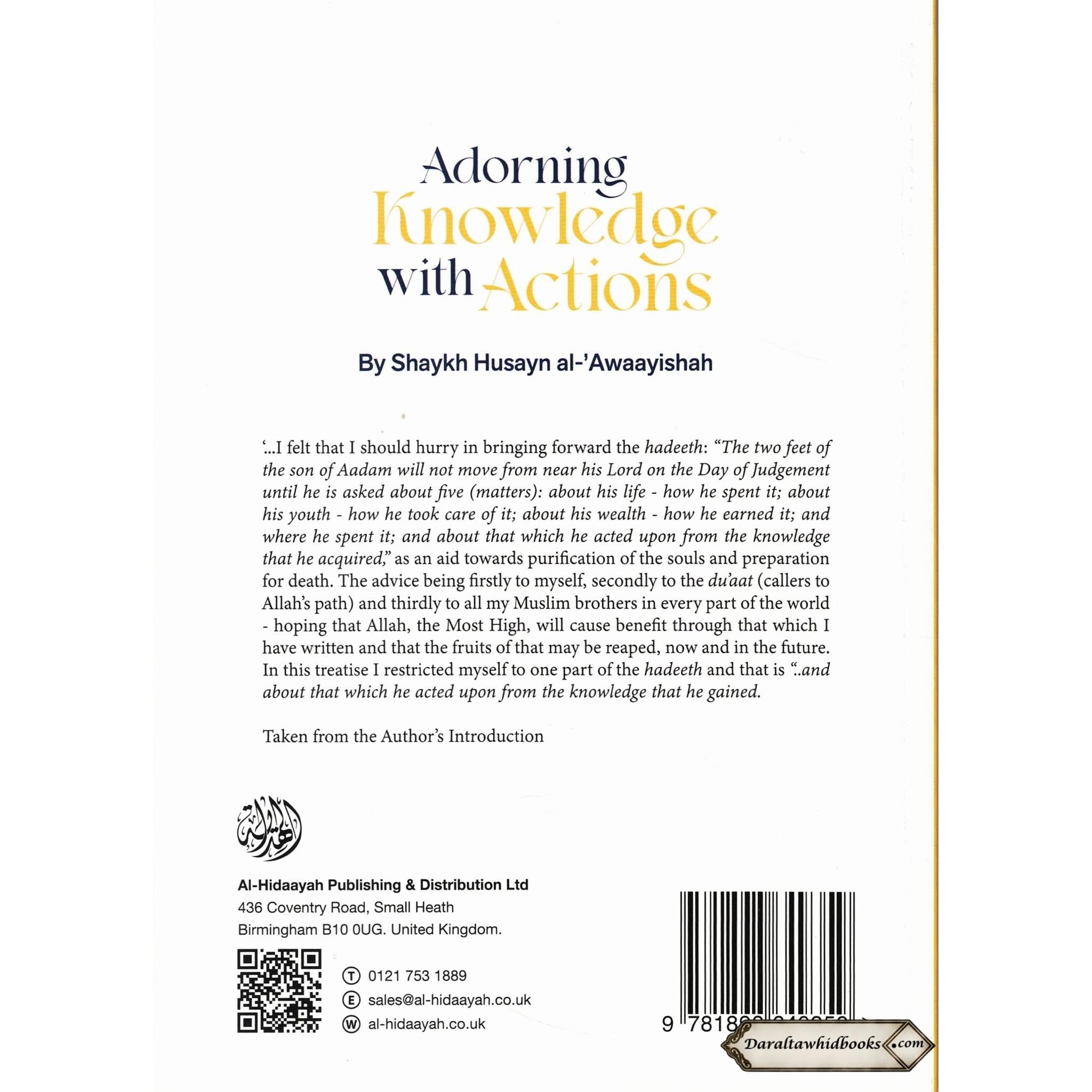 Shaykh Husayn al-Awaayishah's "Adorning Knowledge With Action" is a transforming guide that bridges the gap between obtaining information and adopting it in one's life. The author urges readers to seek knowledge and to beautify it with good actions through profound insights and a thorough understanding of Islamic beliefs. This book serves as a road map for people who want to put their knowledge into action, supporting a comprehensive approach to personal and spiritual development.