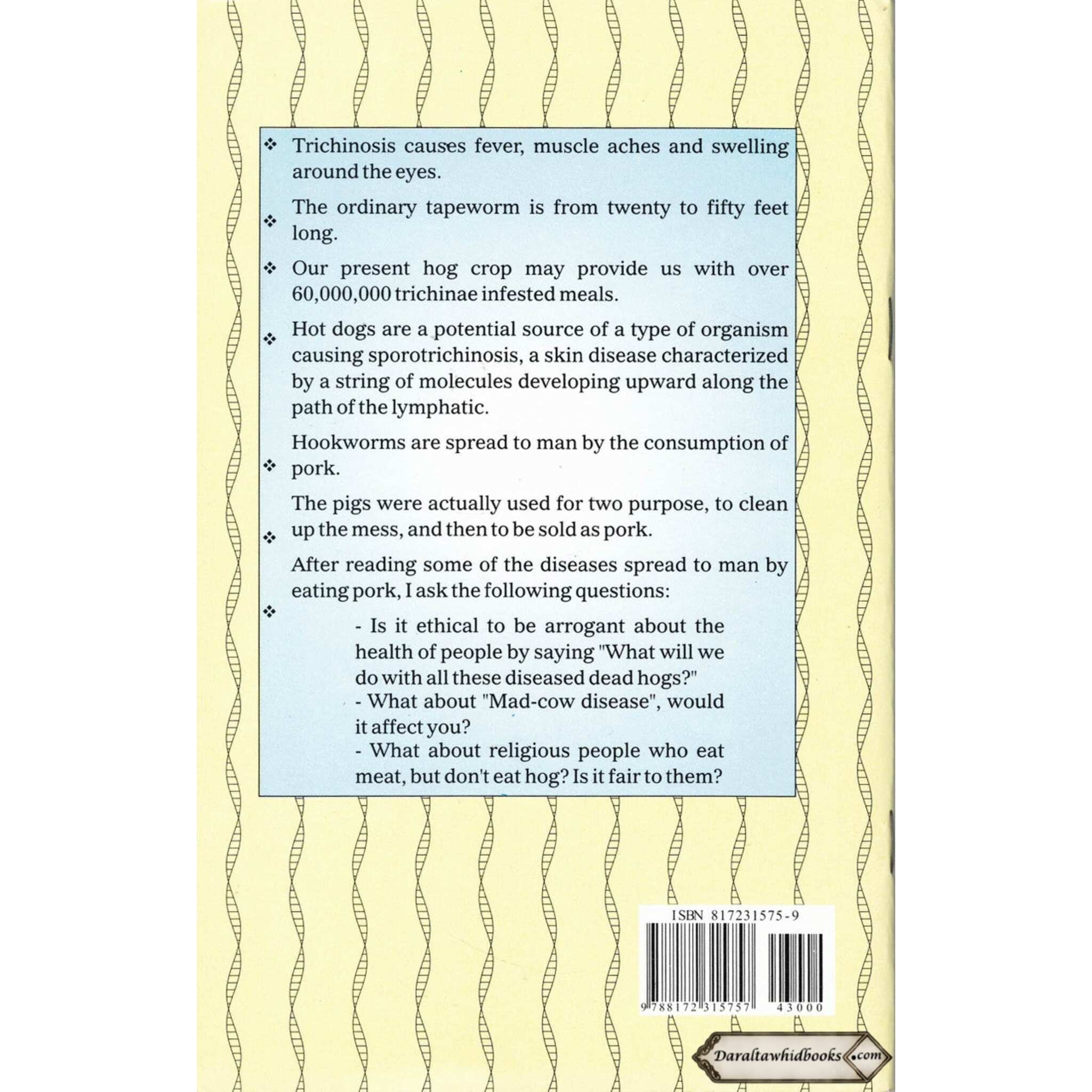 ISBN: 9788172315757 Author: Abolade Nkosi Tayo Binding: Paperback Pages: 42 Size: 8.5 x 5.5 x 0.2 inch Publication Year: 2004 Description About This Book: In "Pork Eating: The Great Risk to Human Health," the author takes a critical look at pork eating and its potential health consequences. The book addresses concerns and sheds light on the health implications of pork intake, focusing on scientific research and dietary considerations to provide an intelligent analysis of the topic. Awareness the dangers: The goal of this comprehensive guide is to offer readers a clear awareness of the potential dangers associated with pork eating. The book methodically investigates the different issues that make pork intake a source of discussion and caution, from microbiological problems to greater health implications. Scientific Insights and Research: The author navigates the health hazards linked with pork intake using scientific insights and research. The book gives a balanced and informed perspective based on studies and conclusions, helping readers to make informed choices about their dietary habits. Nutritional Considerations: "Pork Eating" dives into the nutritional aspects of pork in addition to the health dangers. The book delves into the composition of pork, its impact on general nutrition, and alternate dietary options for a balanced and healthy lifestyle. Cultural and Religious Points of View: Beyond the science, the book considers cultural and theological viewpoints on pork intake. It discusses the relevance of dietary patterns in numerous cultures and religions, giving readers a comprehensive grasp of the various points of view on this difficult issue.