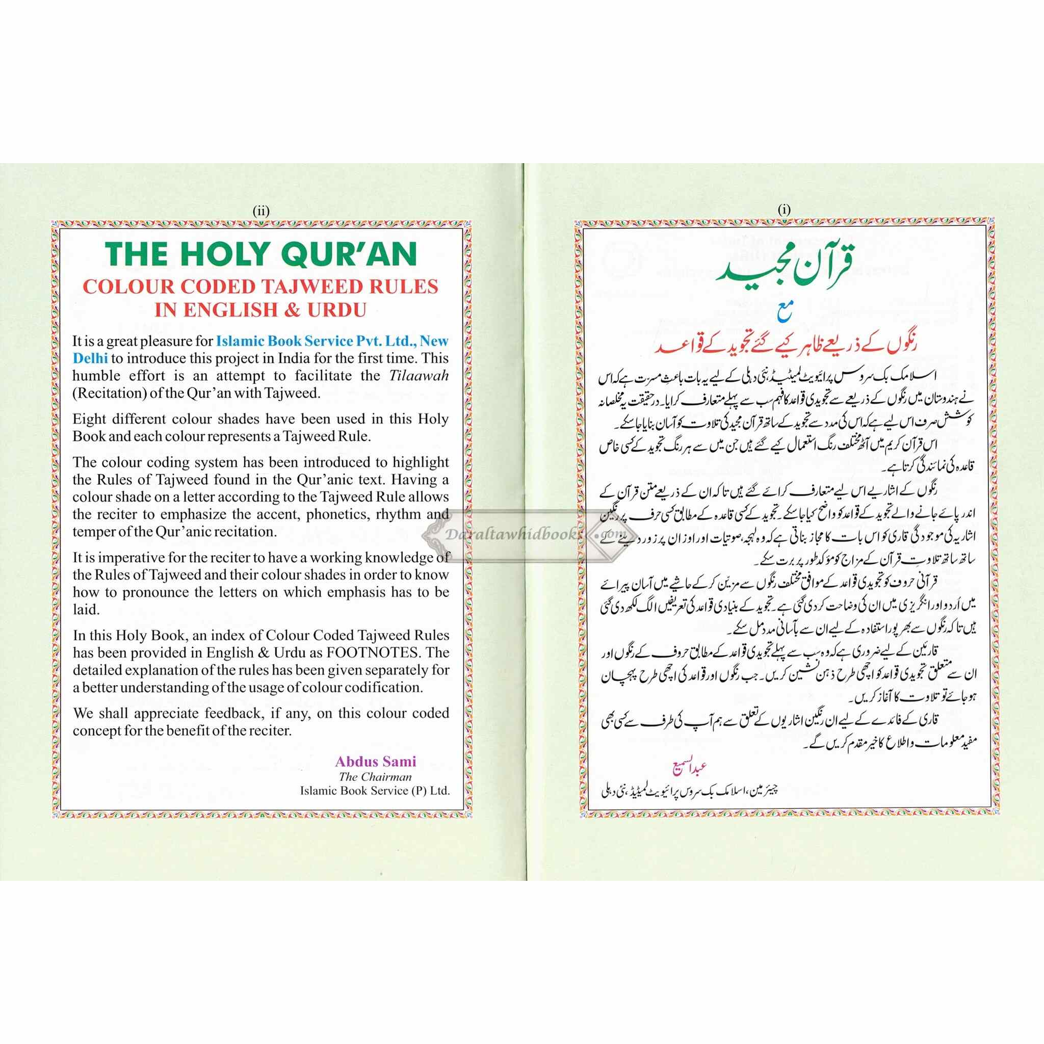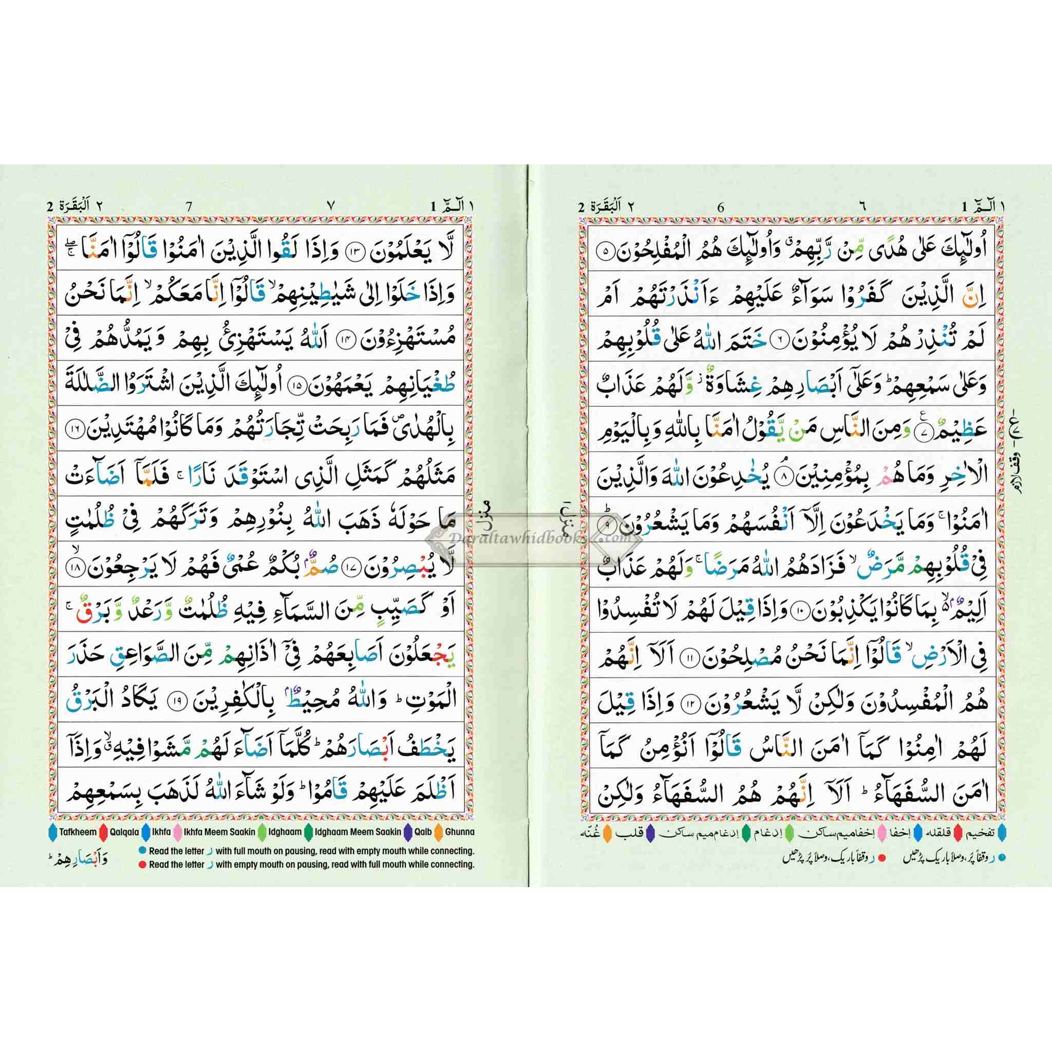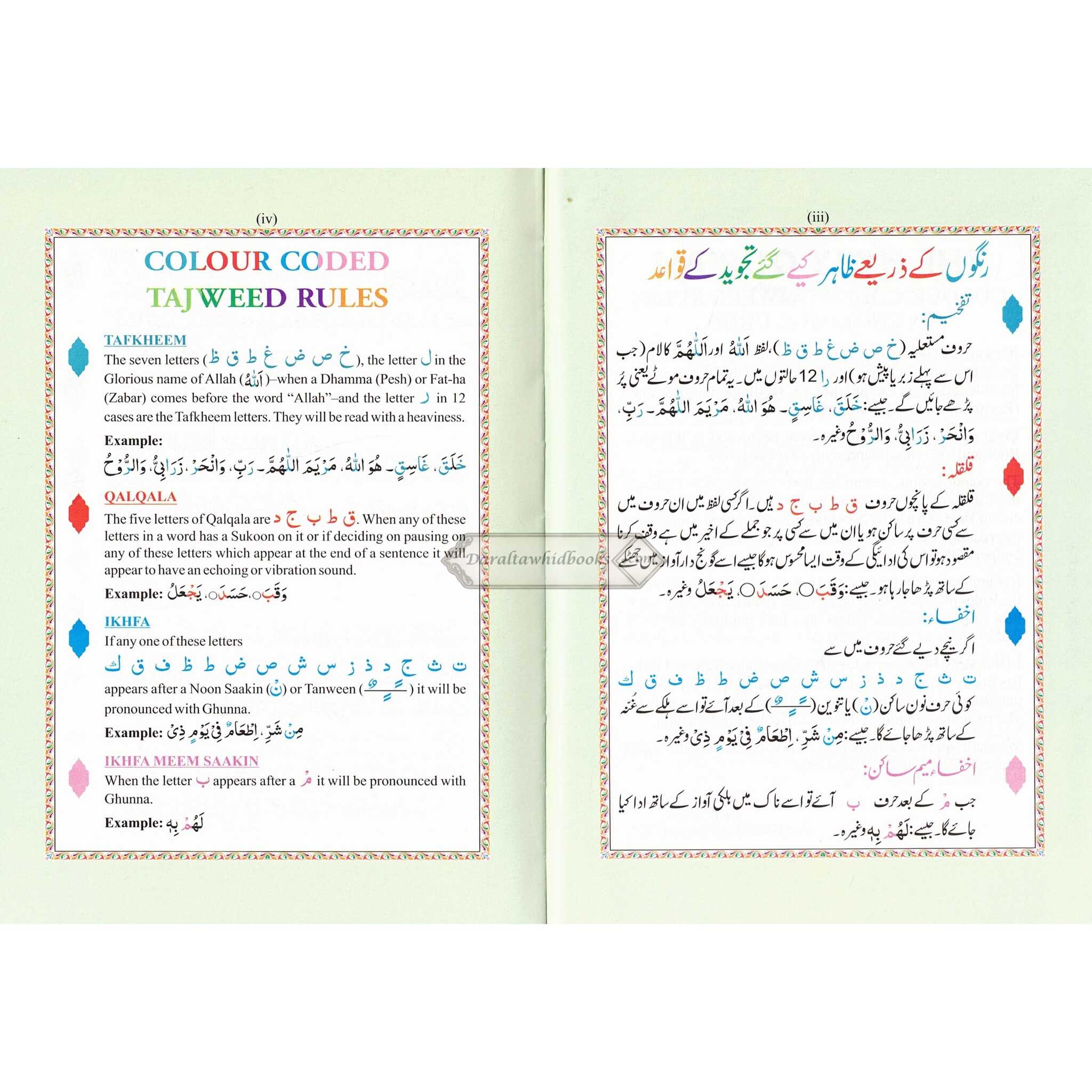 The Holy Quran Colour Coded Tajweed Rules with Colour Coded Manzils is a specific edition of the Quran with two unique features: Tajweed rules and Manzils, both color-coded for simple reference and application.