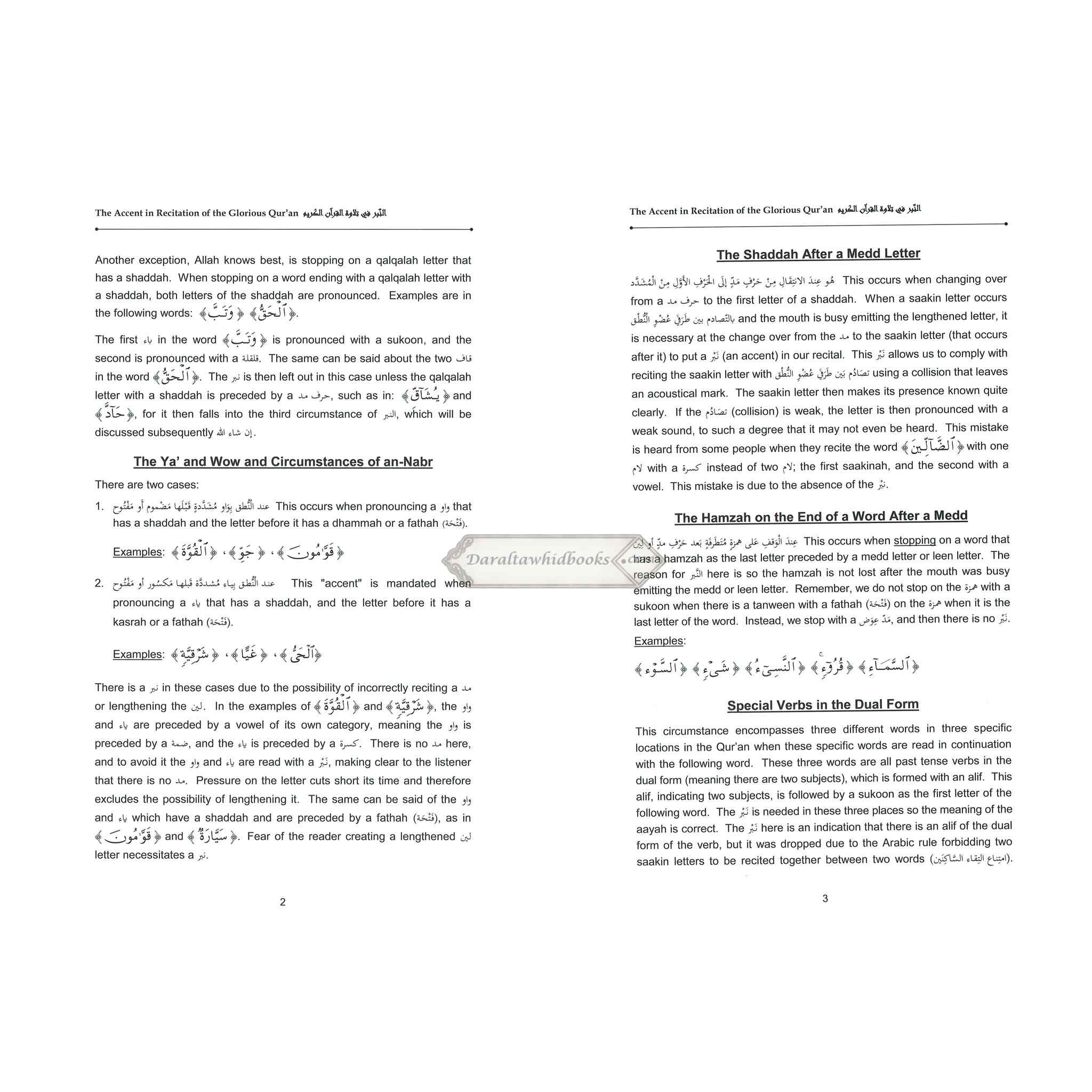 This book explains the concept of the accent(an-nabr) in the recitation of the Glorious Qur'an and the conditions of its use, it also defines and explains the important chapter on the characteristics of the letters, velarization and attenuation (tafkheem and tarqeeq) are covered in the part, as well as the concept of the two alike, the two similar, the two close, and the two far and the rules for idghaam terms is made in this book to assist the student in understanding the last chapter, that of the connecting hamzah(hamzah al-wasl).