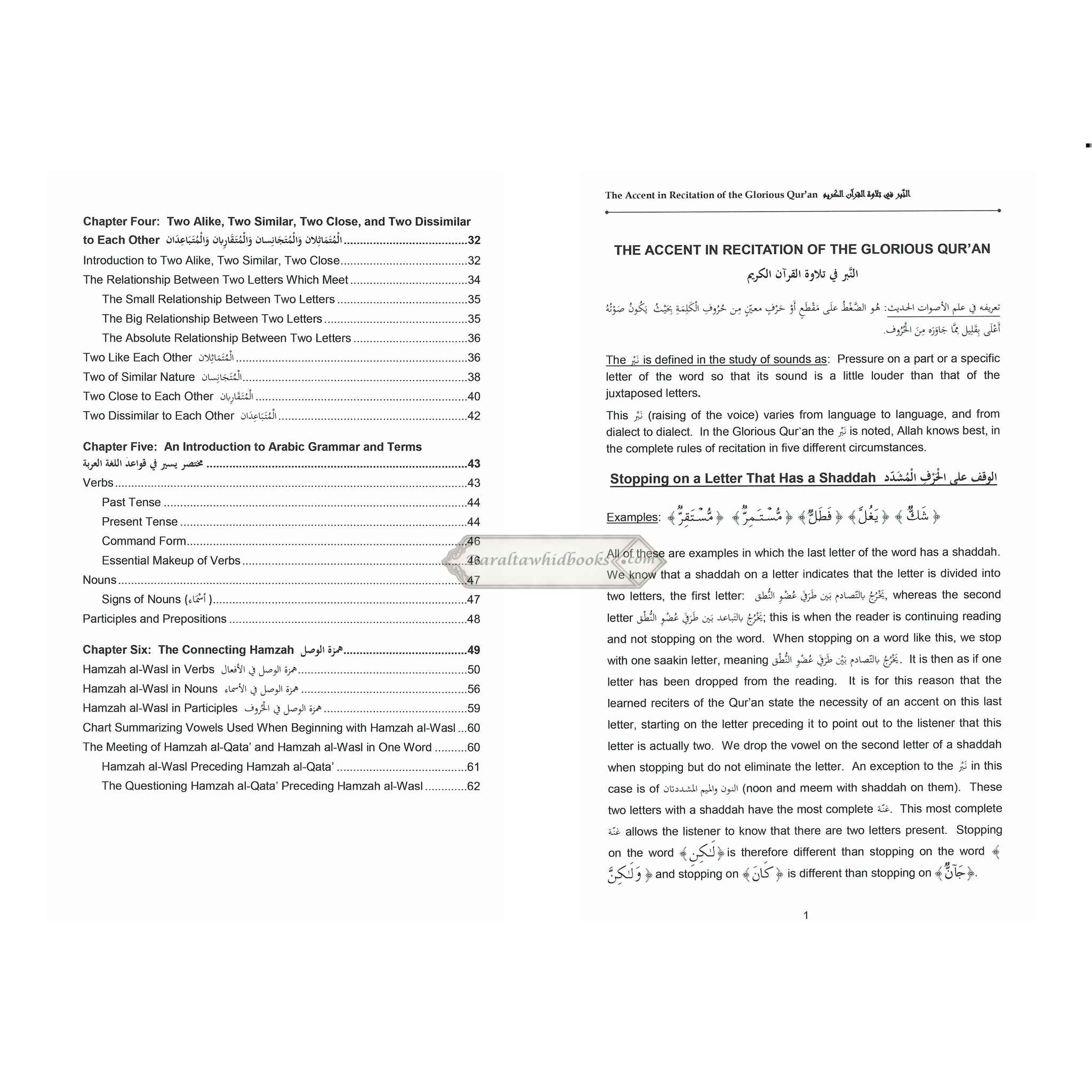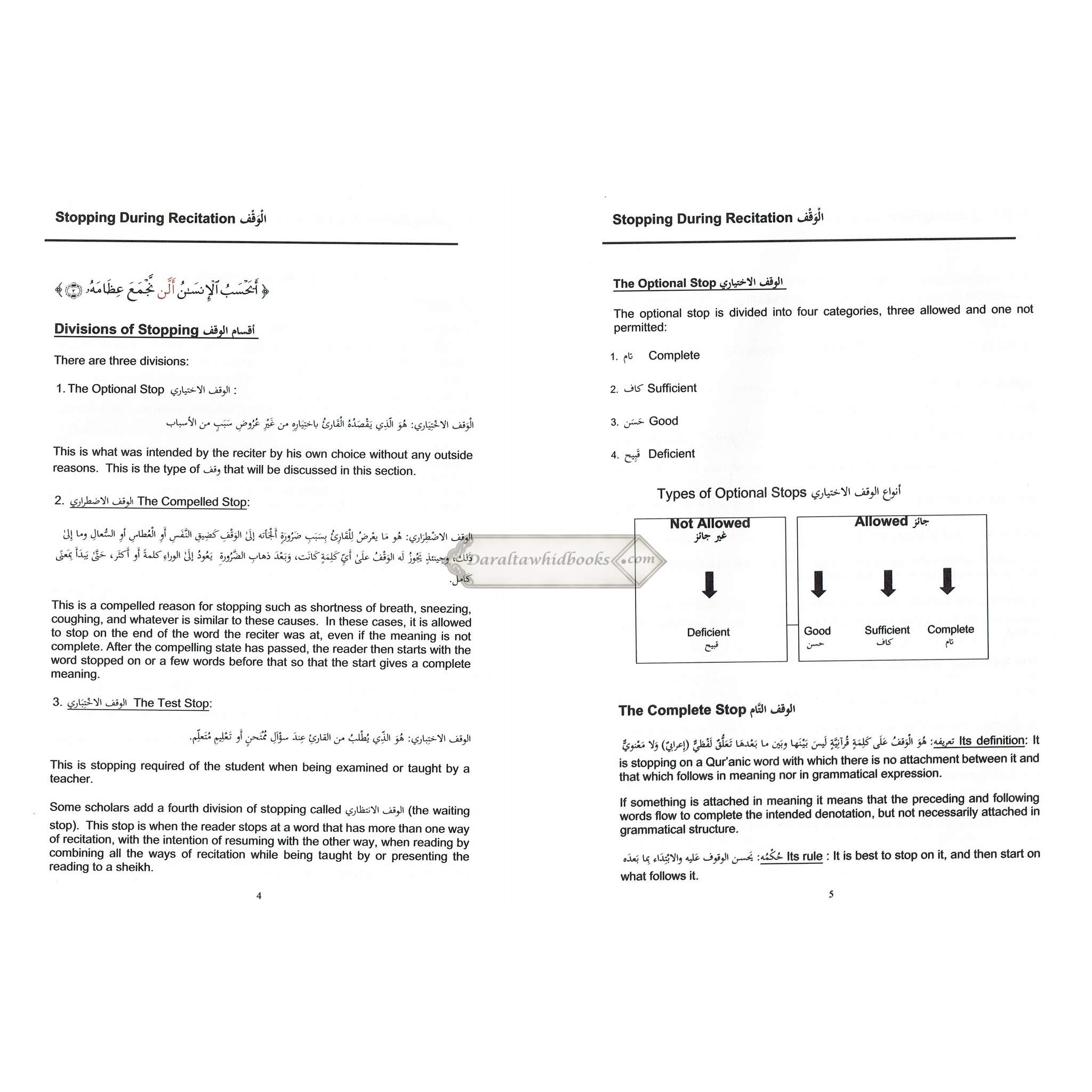 This final book explains the stop and start when reading the Glorious Qur'an, and gives details as to what kind of stop is allowed, what kind preferred, and what kind of stop is forbidden. Stopping on the ends of words with strong endings (consonants)and rules for what is allowed on the last letter of the word is described, including and Stopping on the ends of words with weak endings (words ending in the alif, ya' or wow) and different rules and explanations for these type of words is clarified. One important aspect of Qur'an recitation is knowing and understanding which word combinations are written together and which separately in different parts of the Qur'an as well as in which places of the Qur'an are some words are written with the female and in which places they are written with the This part lays out the different places in the Qu'ran these occurrences take place, so the reader knows how he/she can stop on these words. The words that are read in a special way, or have two allowed ways for the reading of Hafs from 'Aasim by the way of Ash-Shaatibiyyah are detailed in this book. The history of the writing of the Glorious Qur'an and the general rules for the writing of the Qur'an are laid out in the last chapter of this part.