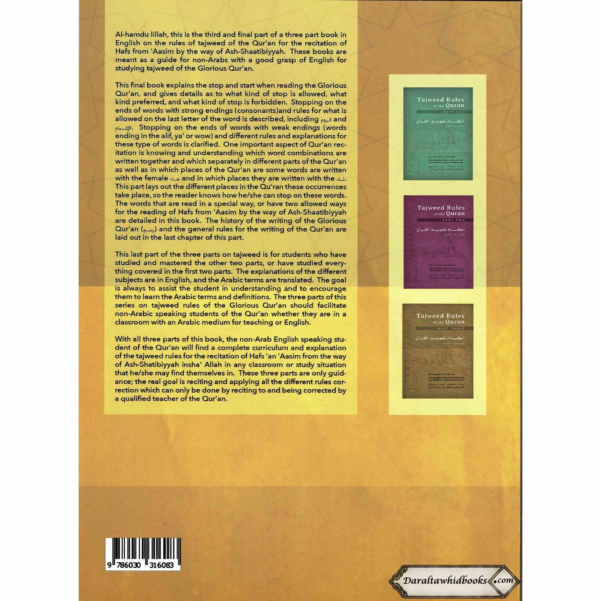 Al-hamdu lillah, this is the third and final part of a three part series in English on the rules of tajweed of the Qur'an for the recitation of Hafs from 'Aasim by the way of Ash-Shaatibiyyah. These books are meant as a guide for non-Arabs with a good grasp of English for studying tajweed of the Glorious Qur'an.