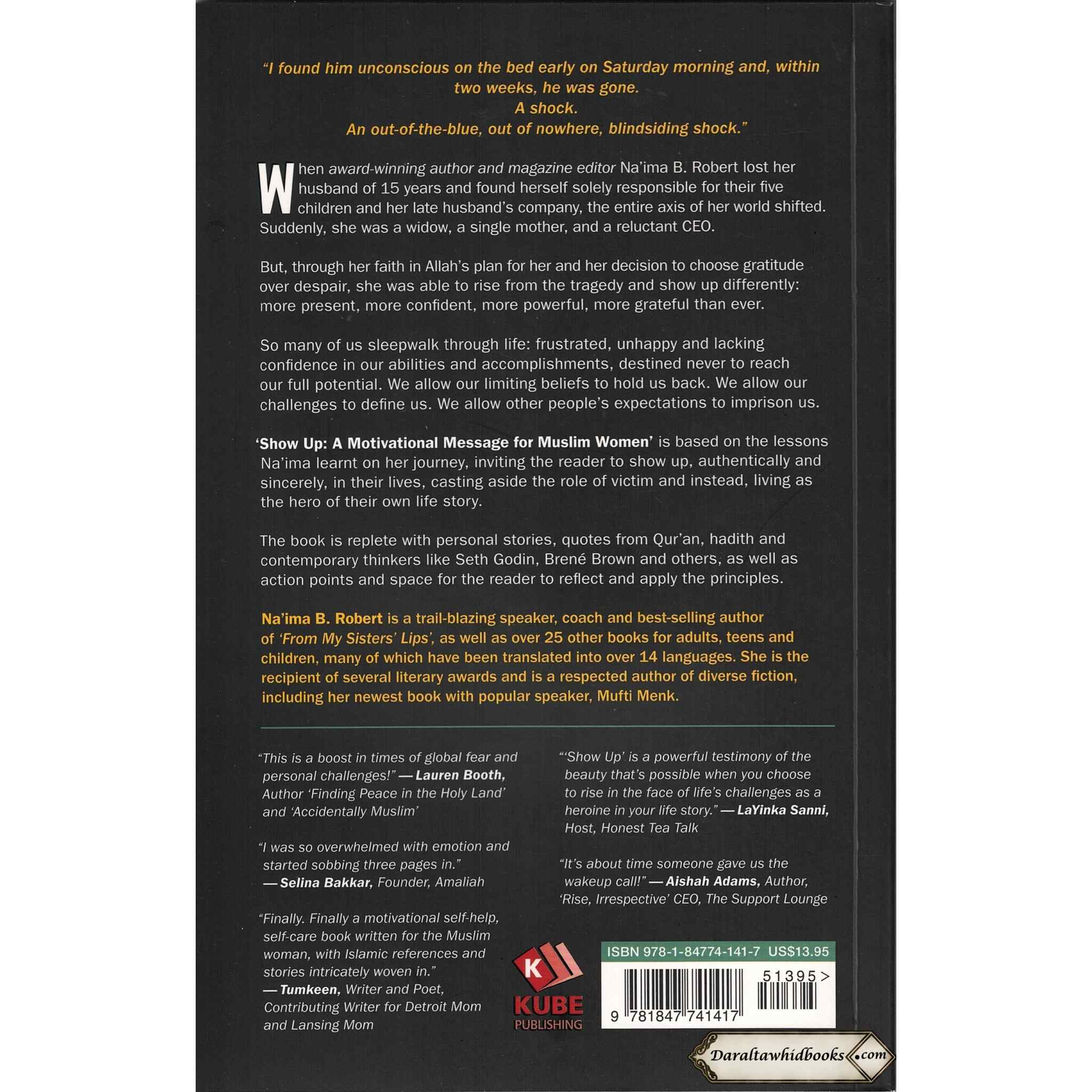 Nai'ma shares the story of how she came to understand the meaning of 'Showing Up' through tragic circumstances and enormous life changes.So many of us sleepwalk through life: frustrated, unhappy and lacking confidence in our abilities and accomplishments, destined never to reach our full potential. We allow our limiting beliefs to hold us back. We allow our challenges to define us. We allow other people's expectations to imprison us.'Show Up: A Motivational Message for Muslim Women' is based on the lessons Na'ima learnt on her journey, inviting the reader to show up, authentically and sincerely, in their lives, casting aside the role of victim and instead, living as the hero of their own life story.It Covers Many Topics including: