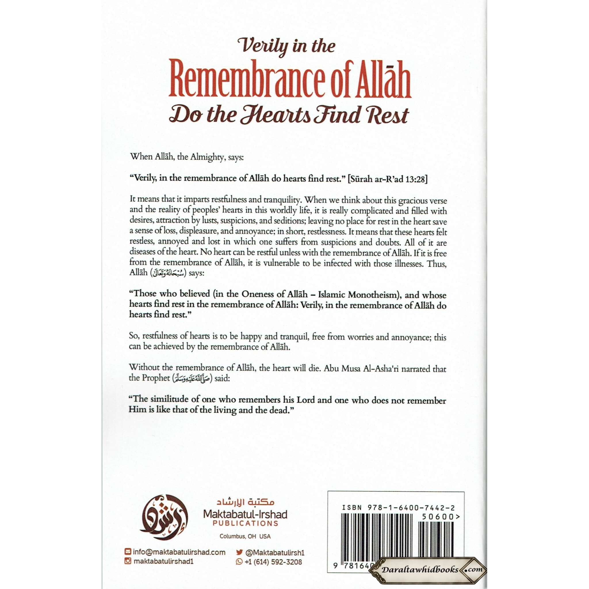 Shaykh Abdur Razzaaq Bin Abdul Muhsin al Badr's book "Verily In The Remembrance Of Allah Do The Hearts Find Rest" is a profound and spiritually enlightening work. This book serves as a guiding light in a world plagued with diversions and confusion, reminding readers of the everlasting wisdom found in remembering Allah.