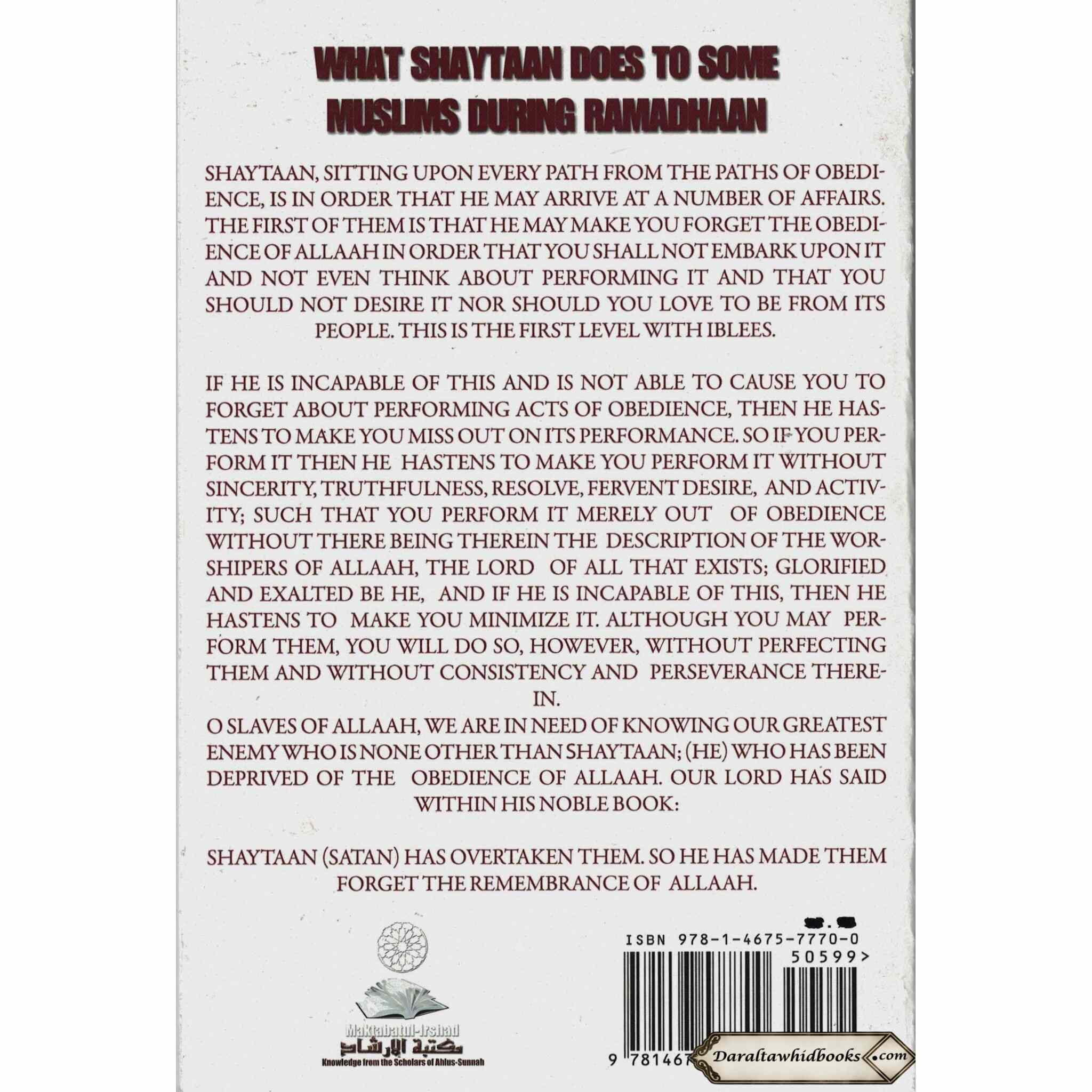 The book focuses on Shaytaan's methods and plans for distracting Muslims from their devotion and worship throughout Ramadan. It gives readers the tools they need to spot these pernicious influences.