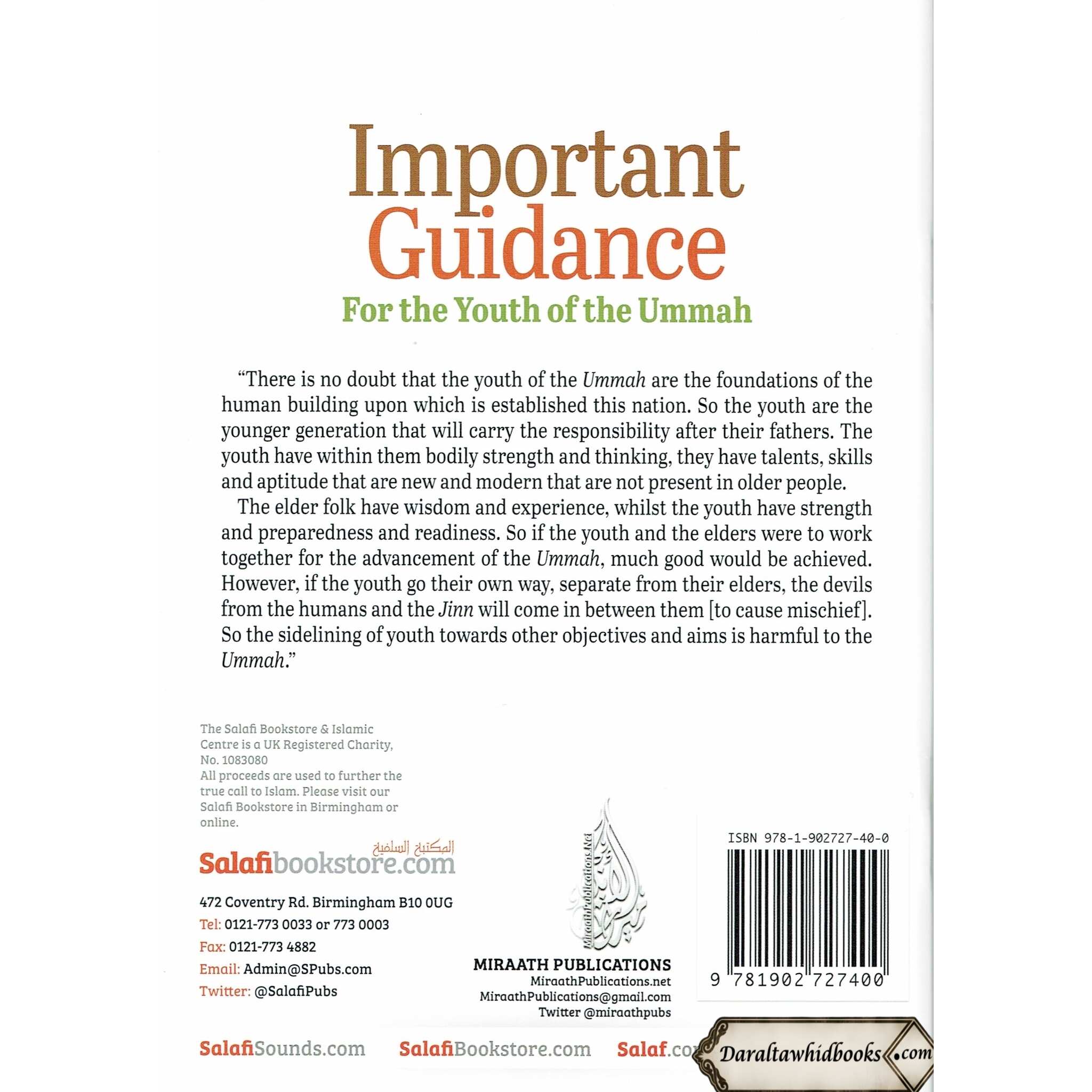 "Important Guidance For The Youth Of The Ummah By Abu Khadeejah Abdul-Wahid, Saleh al-Fawzan" is a magnificent asset for youthful Muslims who need to more readily grasp their confidence, work on their otherworldly associations, and make significant commitments to their networks. It goes about as a beacon, directing youngsters through the troubles of the present world while sticking to Islam's immortal goals and convictions. This work exhibits the journalists' obligation to the otherworldly turn of events and prosperity of Muslim youth, guaranteeing they become mindful and principled individuals from the Ummah.