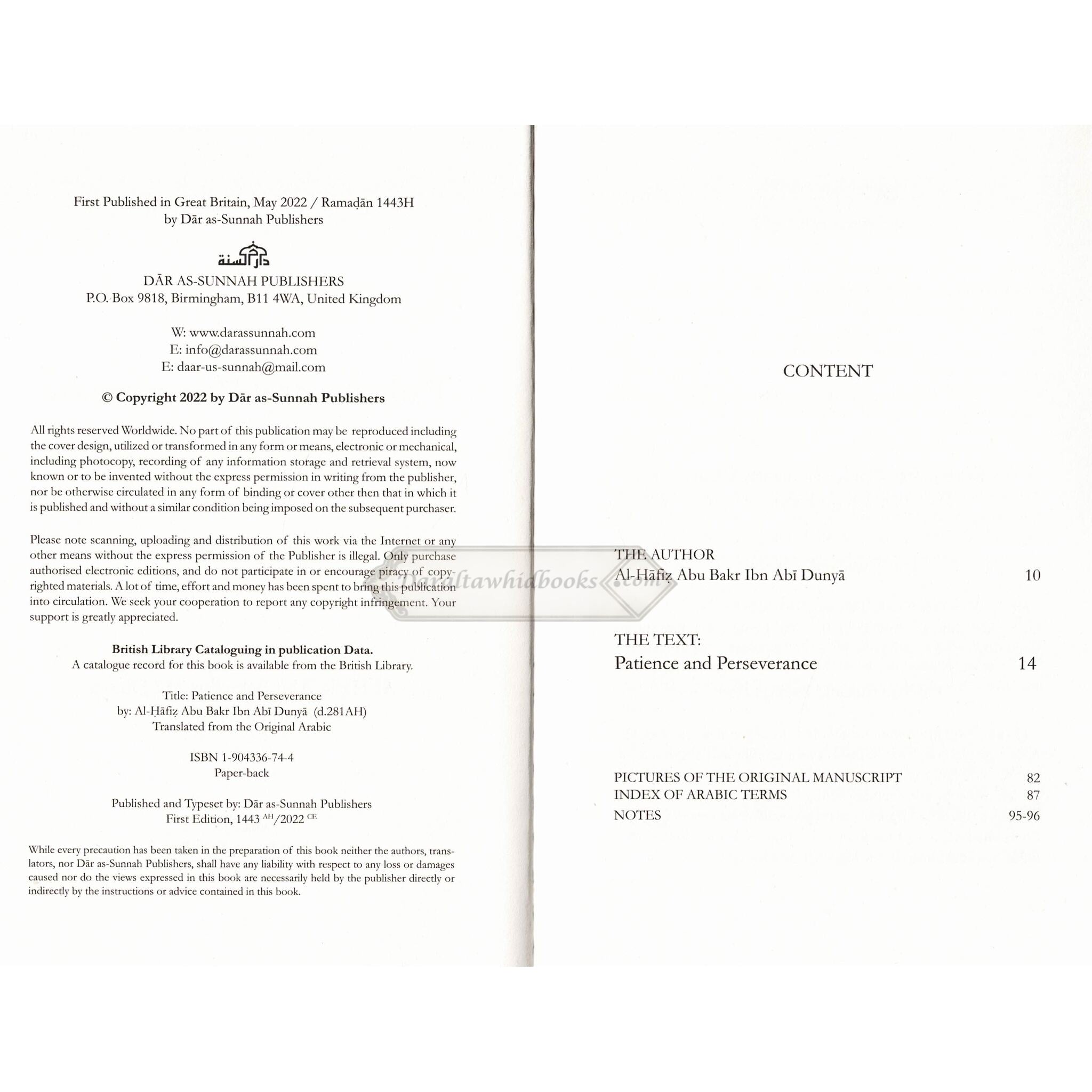 Sulayman ibn Qasim said, "The reward of every deed is known except for patience, for Allah Almighty Said: 'Indeed, those who endure patiently will be given their reward in full without limit.' [Al-Zumar, 10]. The attribute of patience is less about the ability to sit tight and wait out any adversity or misfortune, and more about holding good etiquette and Islamic propriety while waiting. This includes persevering throughout the ordeal, not complaining about one's condition (except to Allah) and recognising that Allah's wisdom and decree necessitate holding good positive thoughts about Him. Allah, the Most High, presses the believers to seek His assistance through patience and prayer. It is a realisation that Allah doesn't put you through hardship except to grant you relief, nor place a burden on you more than you can bear. To know that He tests those whom He loves, will make you appreciate even the harshest of trials you may be going through is in fact, good for you. Allah also Said: "And We test you with evil and good as a trial" [21:35] Meaning: "With evil", to see how you'll show patience. "And with good", to see how you'll show gratitude. 'Al-Sabr wa'l Thawab 'alayha' is Dar as-Sunnah's second instalment of an Ibn Abi Dunya's work. We hope this complete English translation will inspire the reader to appreciate the realities of patience and put in place items of action that will guide them through their own set of difficulties in life.