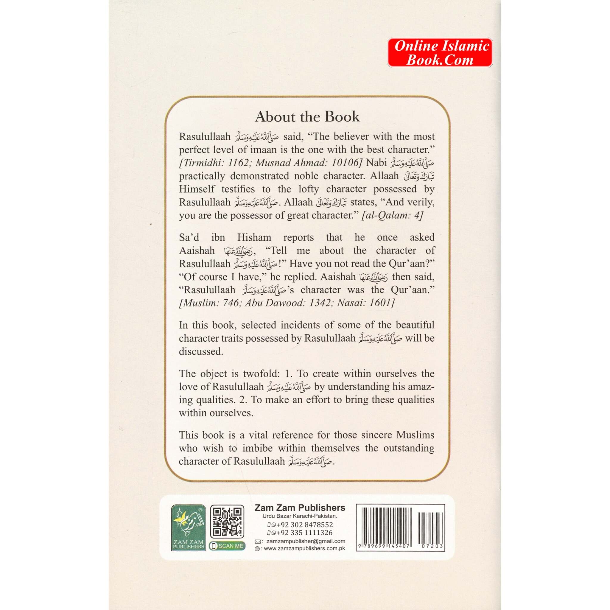 Rasulullaah صل الله عَلَيْهِ وَسَلَّمْ said, "The believer with the most perfect level of imaan is the one with the best character." ]Tirmidhi: 1162; Musnad Ahmad: 10106] Nabi صَلَّى اللَّهُ عَلَيْهِ وَسَلَّمَ practically demonstrated noble character. Allaah تبارك وتعالى Himself testifies to the lofty character possessed by Rasulullaah صَلَّى اللَّهُ عَلَيْهِ وَسَلَّمَ . Allaah تبار وتَعَالَى states, and verily, you are the possessor of great character." [al-Qalam: 4] Sa'd ibn Hisham reports that he once asked Aaishah رضى اللهُ عَنْهَا Tell me about the character of Rasulullaah صَلَّ اللهُ عَلَيْهِ وَسَةٌ !" Have you not read the Qur'aan?" "Of course I have," he replied. Aaishah رضي الله عنها then said, "Rasulullaah صَلَّى اللَّهُ عَلَيْهِ وَسَلَّمْ 's character was the Qur'aan." [Muslim: 746; Abu Dawood: 1342; Nasai: 1601] In this book, selected incidents of some of the beautiful character traits possessed by Rasulullaah صَلَّى اللَّهُ عَلَيْهِ وَسَلَّمْ will be discussed. The object is twofold: 1. To create within ourselves the love of Rasulullaah صَلَّى اللَّهُ عَلَيْهِ وَسَلَّمَ by understanding his amaz- ing qualities. 2. To make an effort to bring these qualities within ourselves. This book is a vital reference for those sincere Muslims who wish to imbibe within themselves the outstanding character of Rasulullaah صَلَّى
