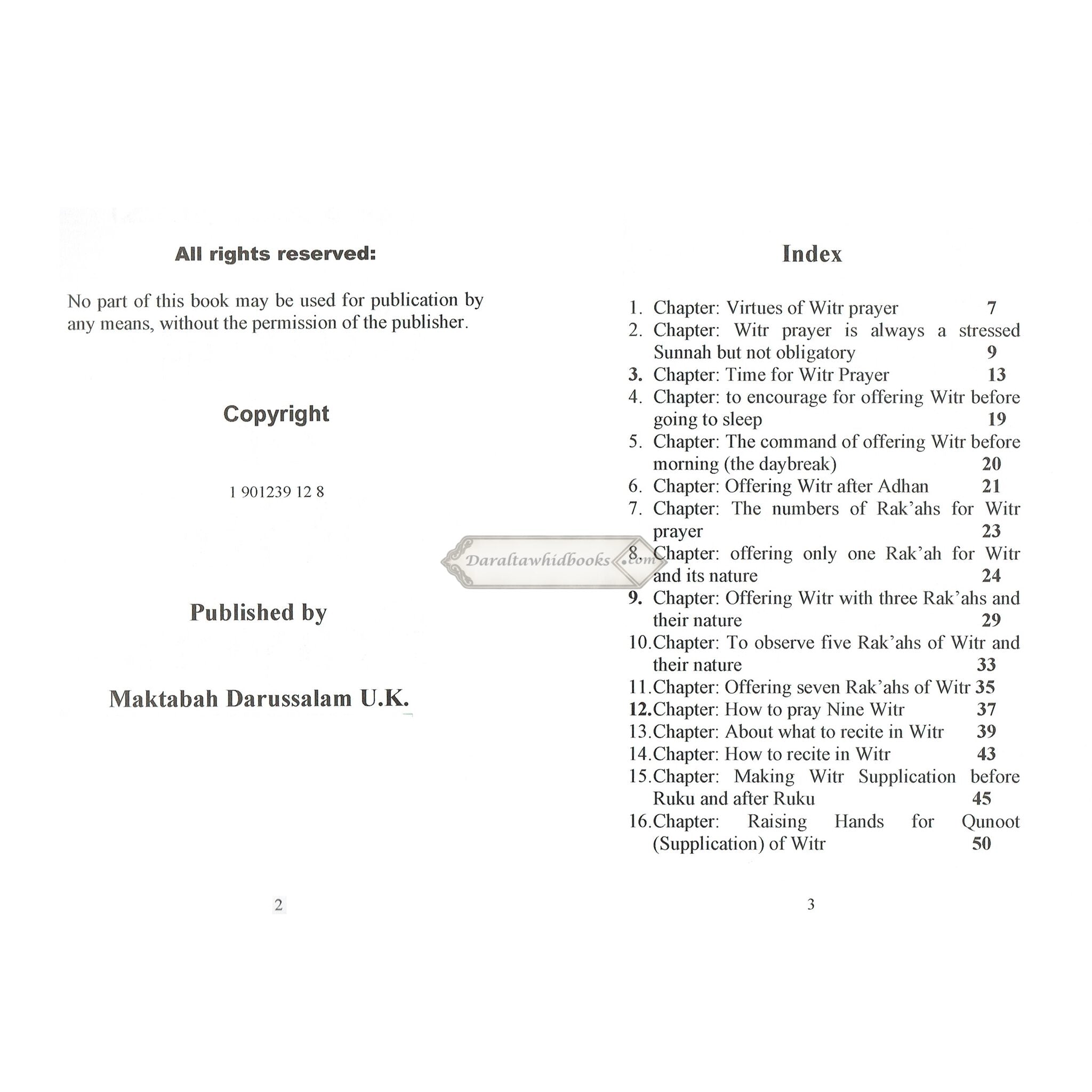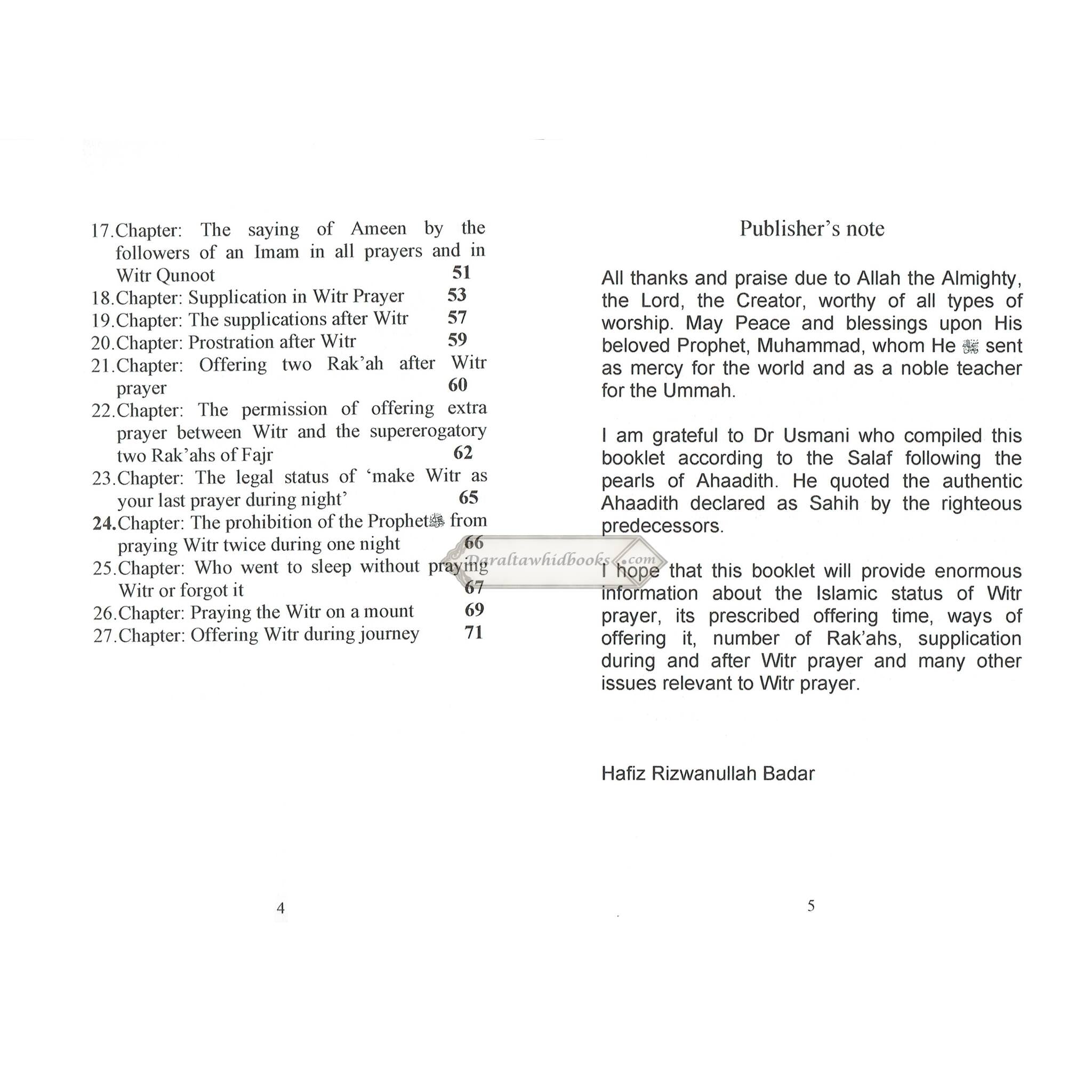 The book begins by outlining the significance and value of the Witr prayer in Islam. Readers learn about its special status as a kind of voluntary worship that increases one's connection with Allah.