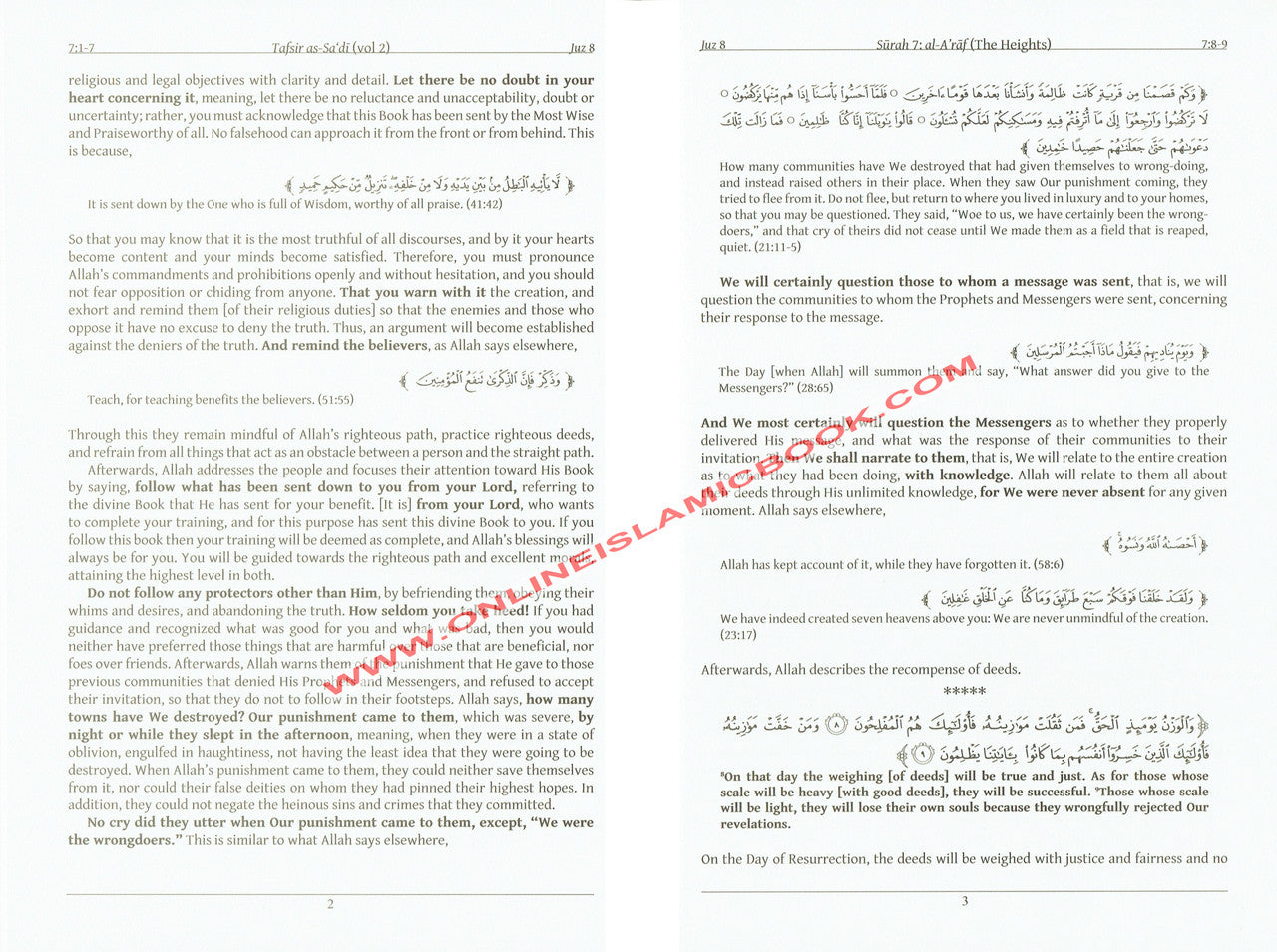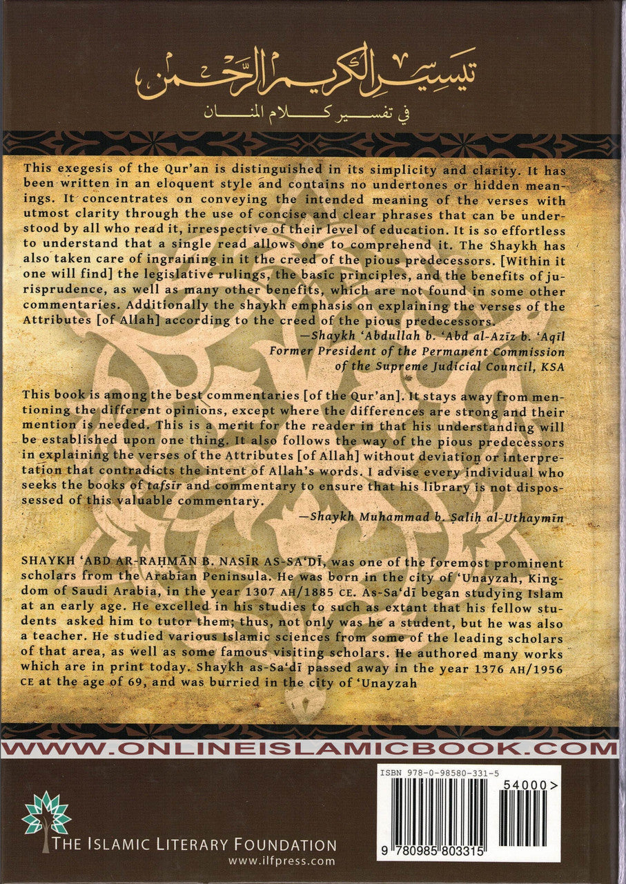 Shaikh Abd ar-Rahman receptacle Nasir as-Sa'di, a prestigious Islamic researcher and exegete, adds to this astounding work his broad information on Islamic custom, regulation, and religious philosophy. He makes sense of the implications and lessons tracked down all through the Quran, empowering perusers to investigate the profundities of its heavenly message, with extraordinary tender loving care and an unmistakable, open style.
