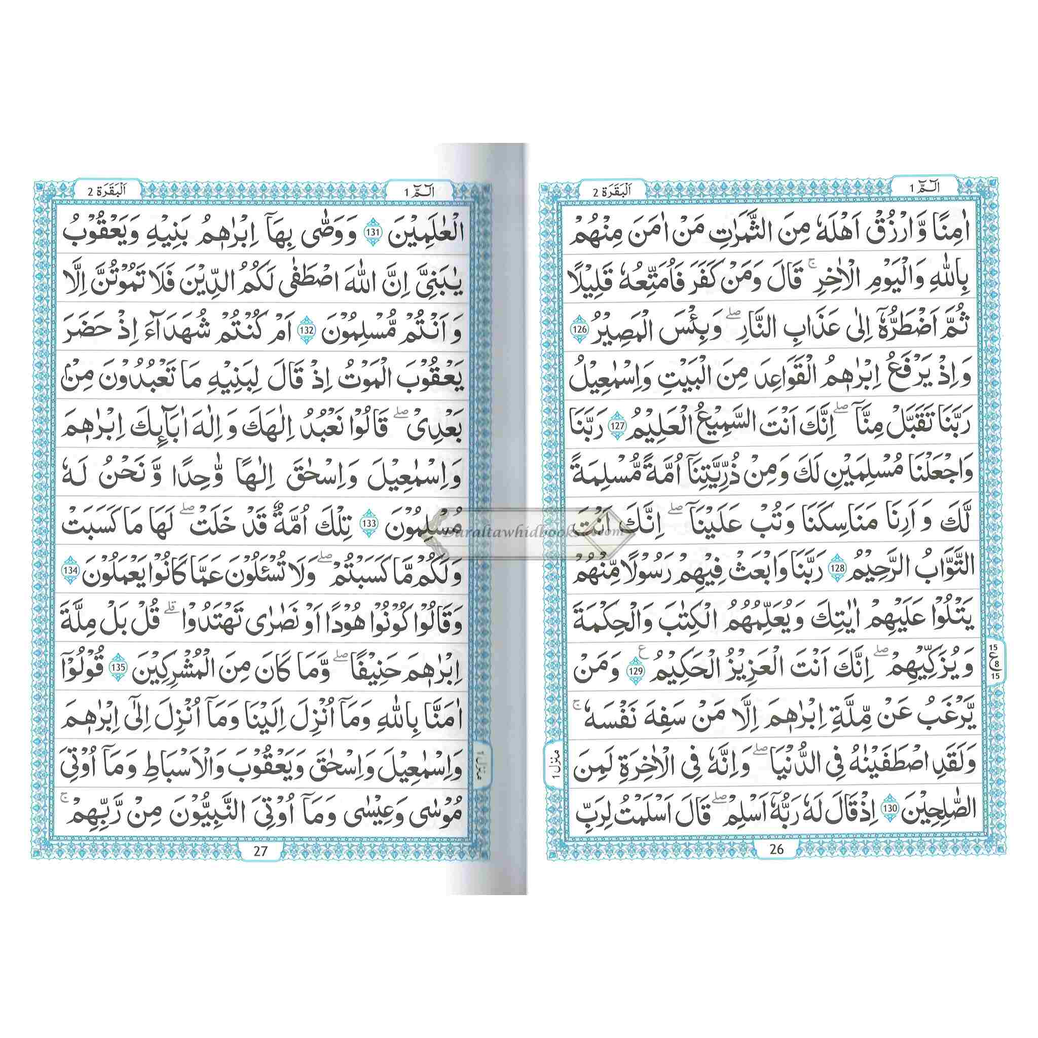 This Quran is amply proportioned, measuring approximately 9.8 x 7.0 inches. The wider size provides for more area for the Arabic language, making it easier on the eyes, particularly for people with visual impairments.