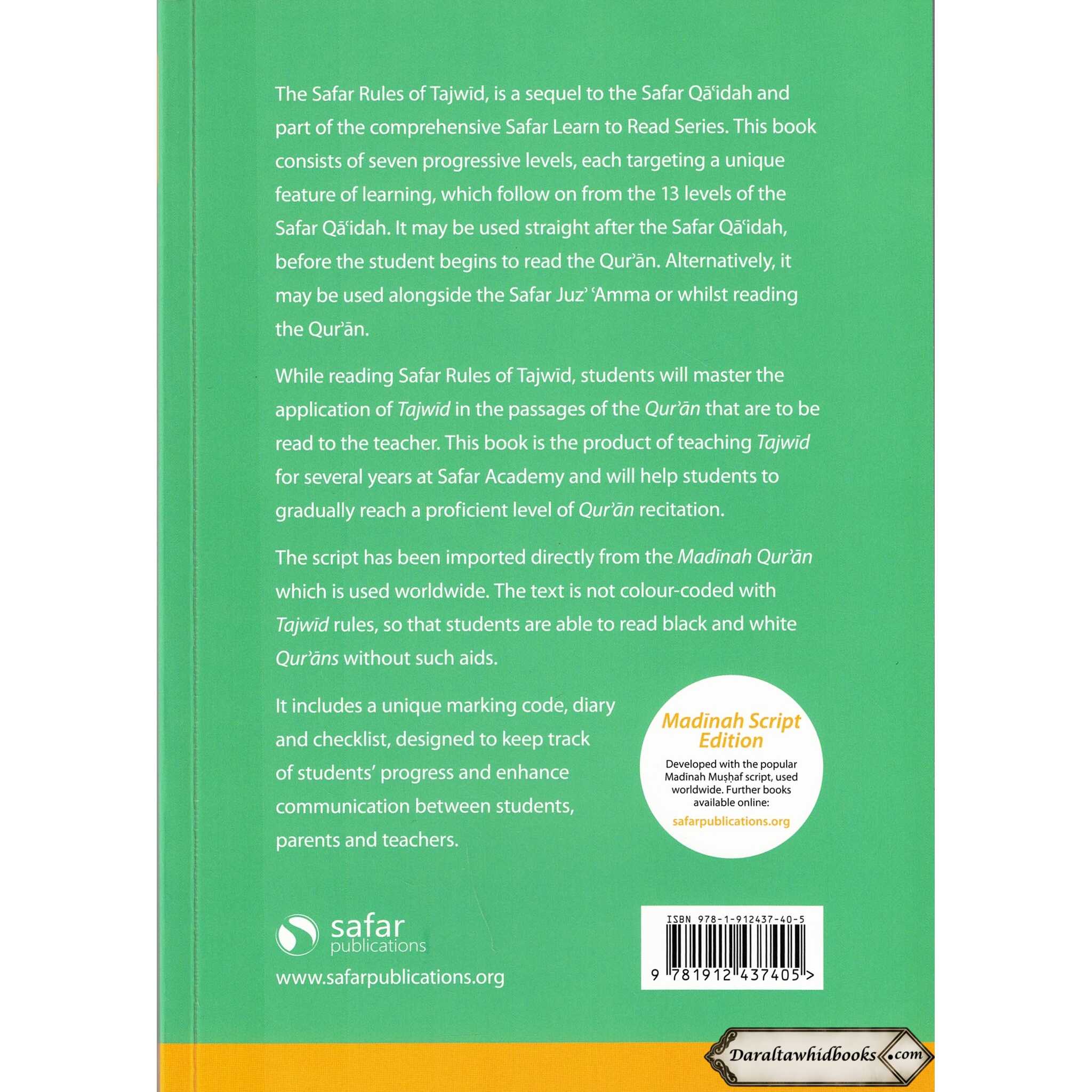 An instructional book called "Rules of Tajweed (Safar Learn to Read Series) - Madinah Script" is intended to help readers grasp the rules of Tajweed as well as the correct pronunciation and recitation of the Quran. The book offers a thorough explanation of Tajweed, addressing issues like pronunciation, articulation points, elongation, and the unique properties of the numerous letters and sounds in the Quran. It provides thorough justifications and illustrations to aid students in comprehending and effectively using Tajweed laws.Rules of Tajwīd, is a sequel to the Safar Qāʿidah and part of the comprehensive Safar Learn to Read Series. This book consists of seven progressive levels, each targeting a unique feature of learning, which follow on from the 13 levels of the Safar Qāʿidah. It may be taught alongside Safar Juz ʿAmma or while a student starts to read the Qurʾān. While reading the book, students will master the application of tajwīd in the passages of the Qurʾān that are to be read to the teacher. This book is the product of teaching tajwīd for several years at Safar Academy and will help students to gradually reach a proficient level of Qurʾān recitation. The script has been imported directly from the Madīnah Qurʾān which is used worldwide. The text is not colour-coded with Tajwīd rules, so that students are able to read black and white Qurʾāns without such aids. It includes a unique marking code, diary and checklist, designed to keep track of students' progress and enhance communication between students, parents and teachers.