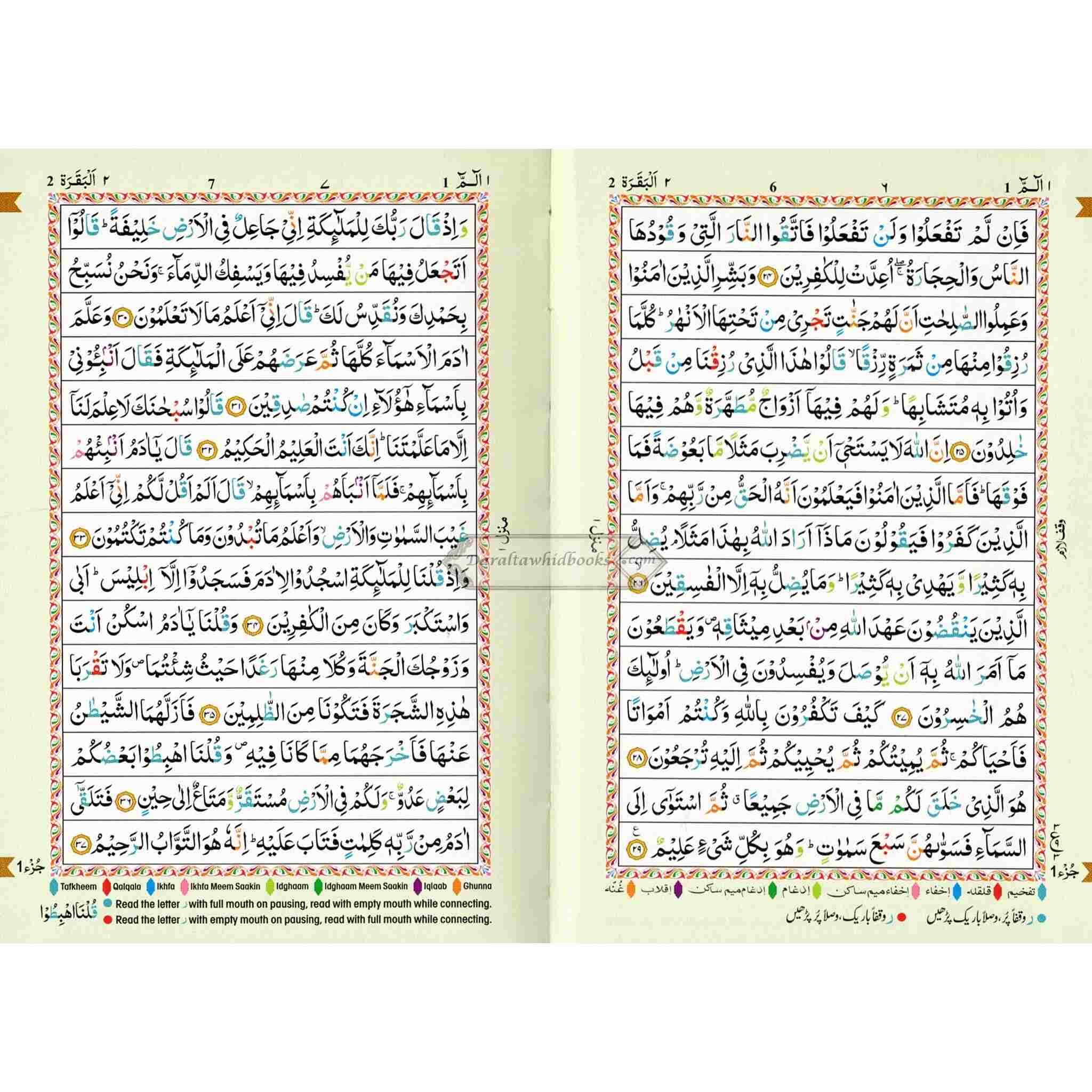 A color-coded Quran in an Arabic script that is easy to read for the non-Arabic speaking person as well. Seven different-color shades have been used: each color representing a different tajwid rule. Letters are colored according to the corresponding tajweed rule. The actual rules of tajwid in English are included in the back of the Quran. This edition of the Qur'an can help those who desire to recite the Qur'an correctly with the proper pronunciations and intonations.