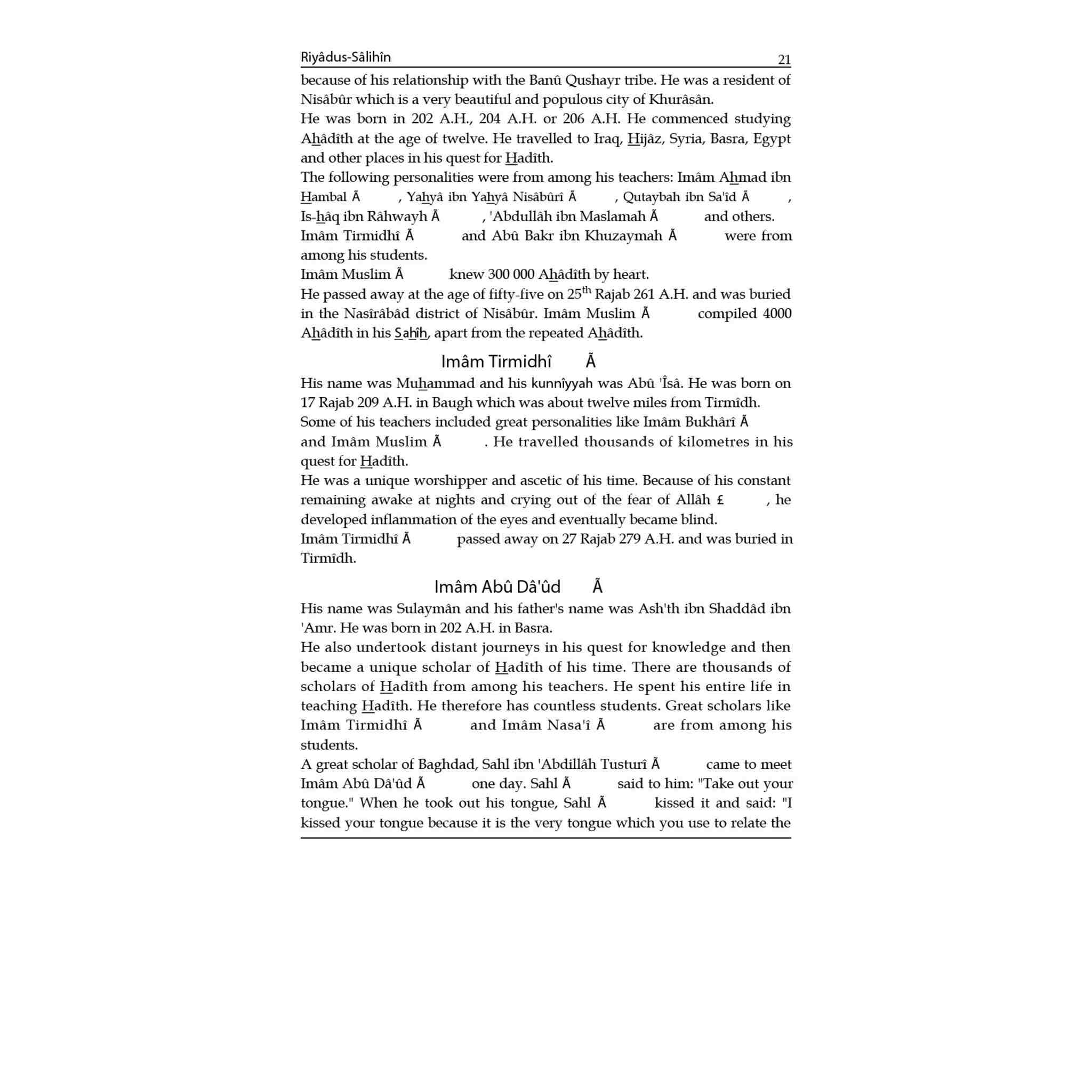 We feel it necessary to provide a short life-sketch of the compilers of Hadith because it is their narrations that are contained in this book, Riyad as-salihin.