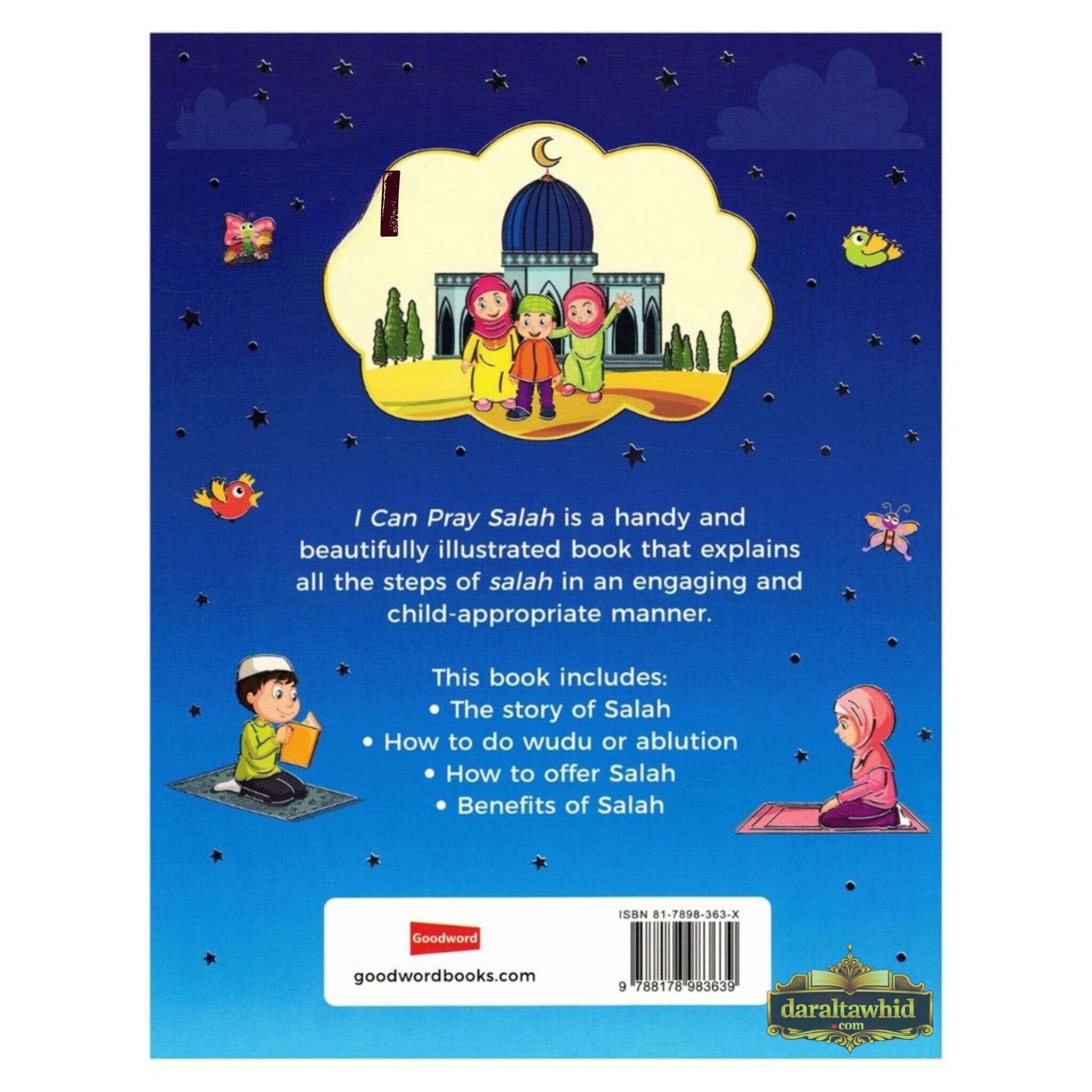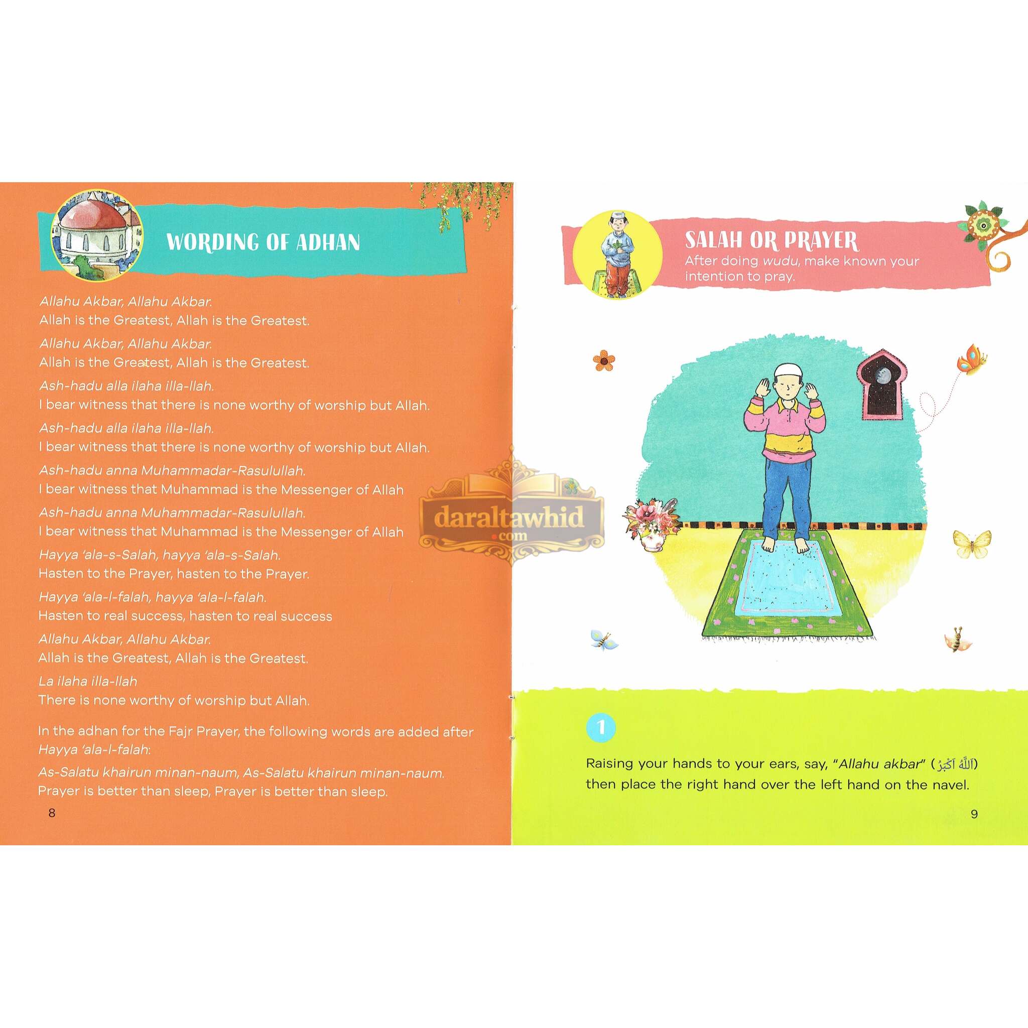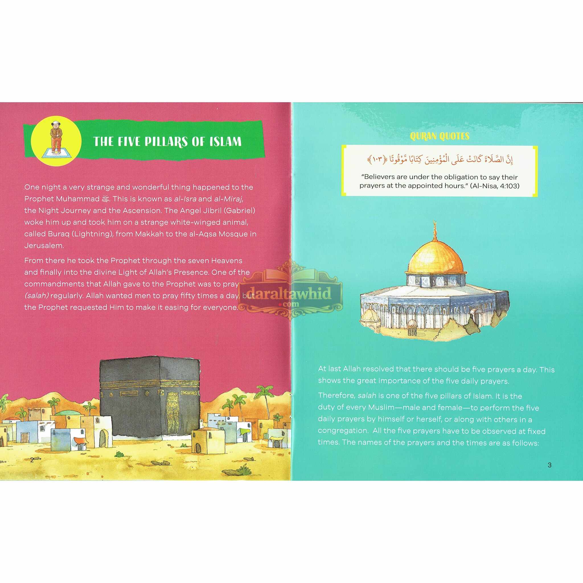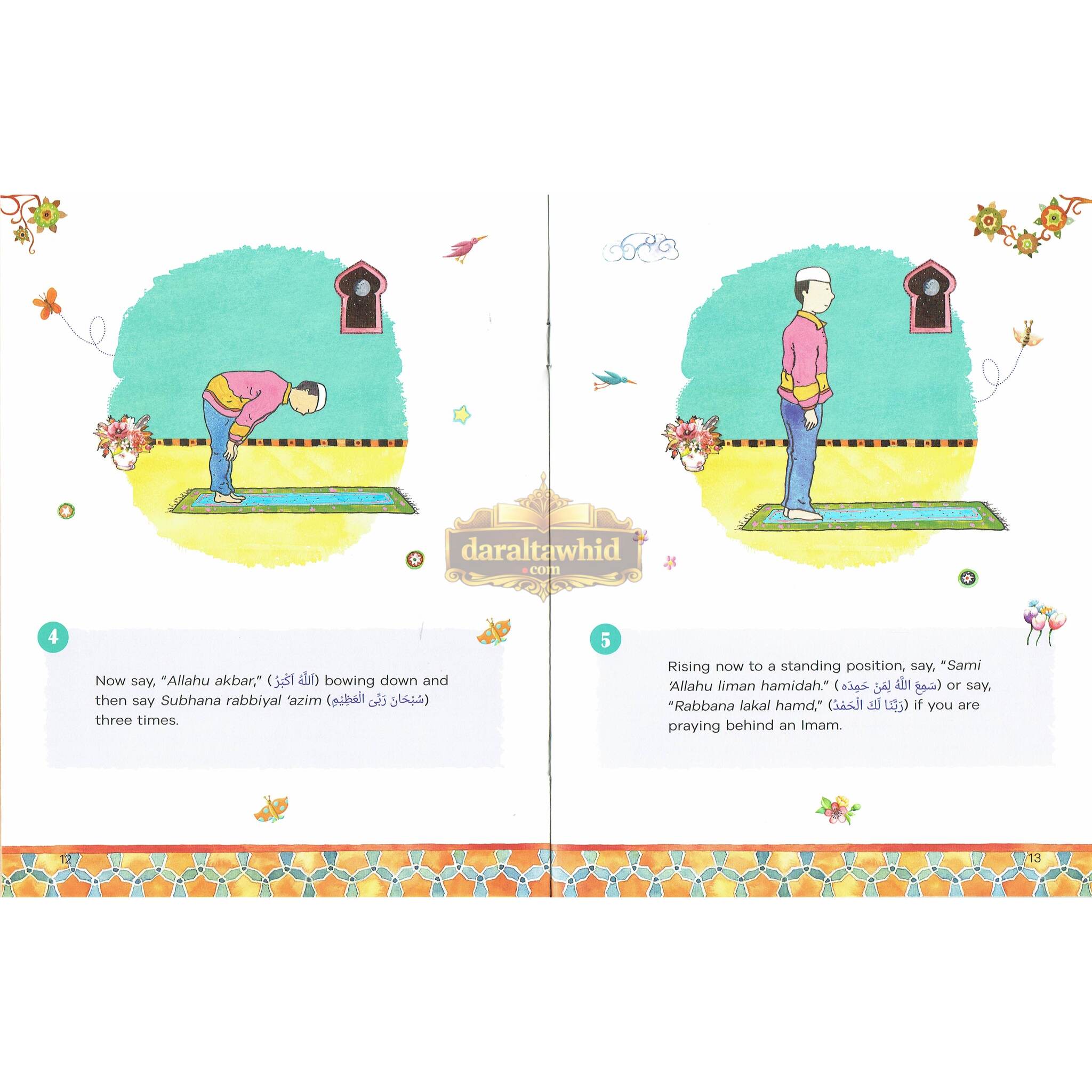 The targeted learning process is presented as a fun journey in the context of learning and practicing "I Can Pray Salah". Every page is covered with cheerful, eye-catching drawings that show children like them praying Salah, which creates a familiar, positive atmosphere. The last few chapters of the book contain instructions on how to pray these particular prayers, and since they are described in a simple manner and divided into easily understandable steps, the child would be able to follow along easily.